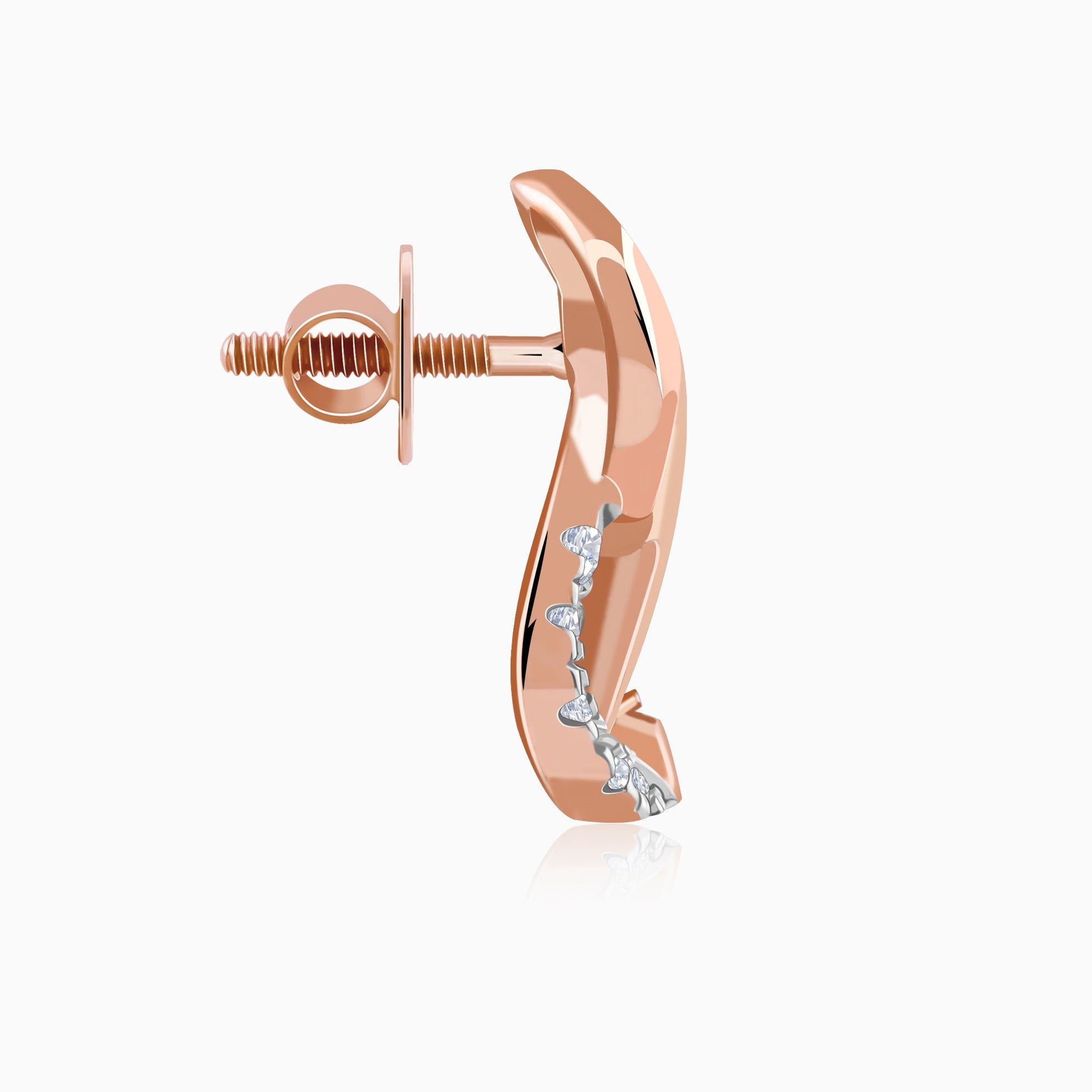 These pure rose gold earrings for women showcase a graceful infinity loop design. The bottom half of the loop is set with a row of sparkling lab grown diamond accents.