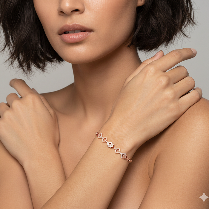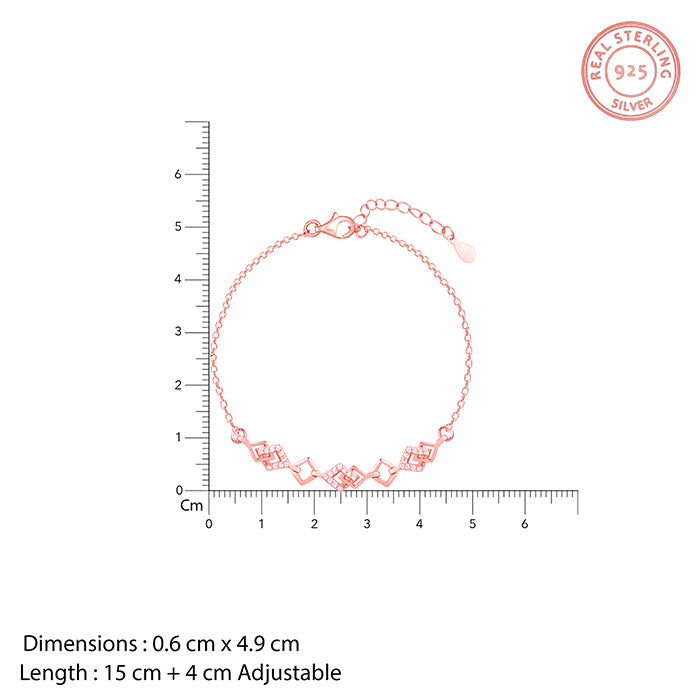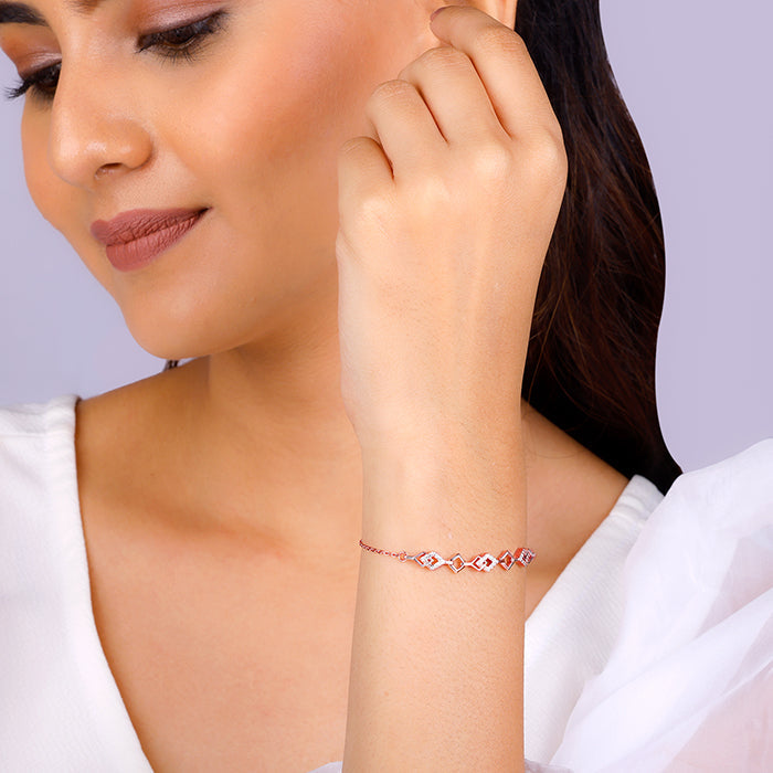This rose gold bracelet is interconnected with one another where the alternate element is studded with zircons.