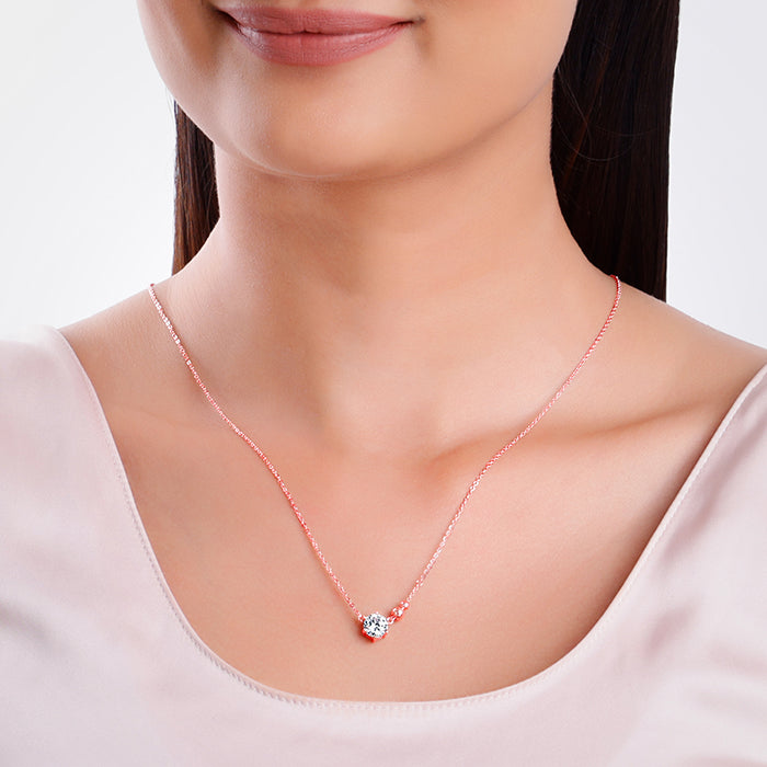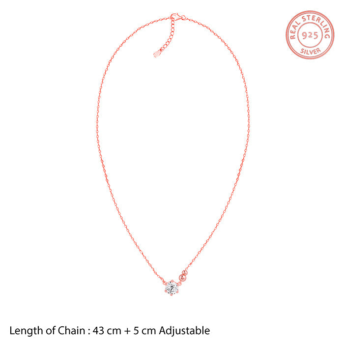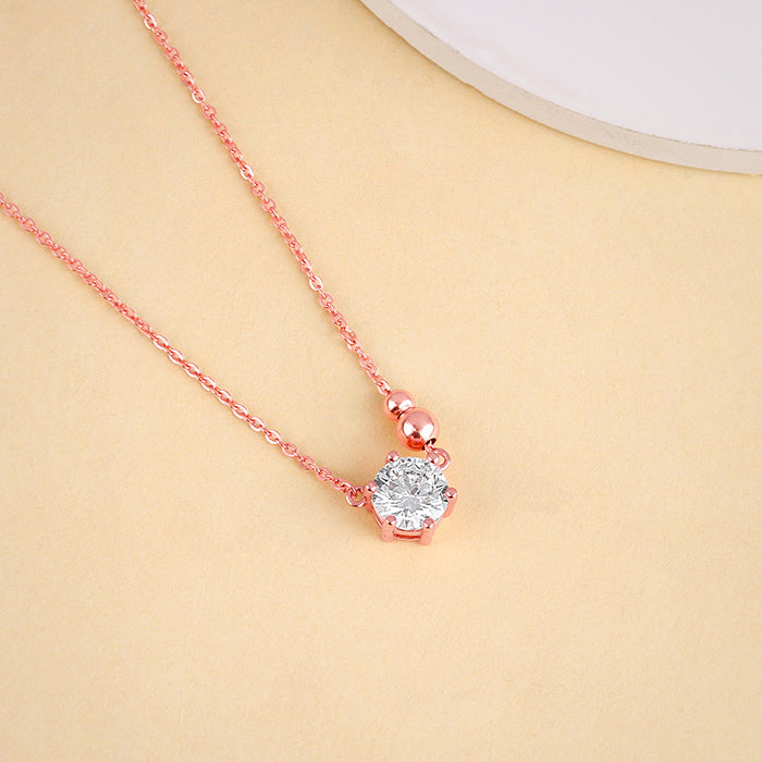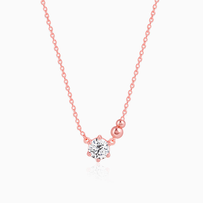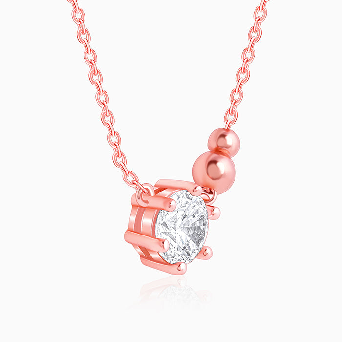 This rose gold necklace for women features a circular zircon at the centre. Two polished rose gold balls are suspended from the link chain.