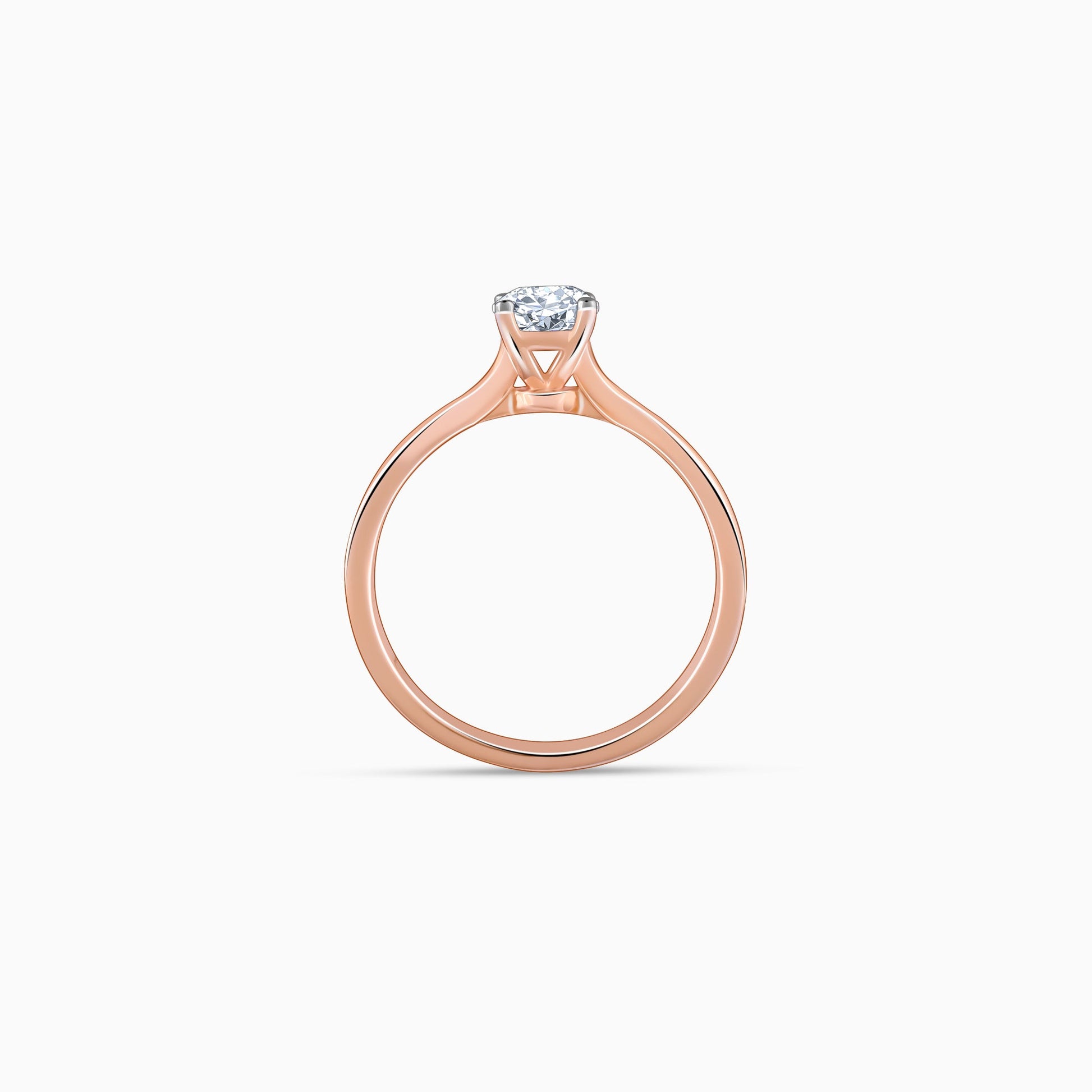 This pure rose gold ring for women features a round-cut lab-grown diamond at the centre in a four-prong setting. The ring features a reverse-tapered band.