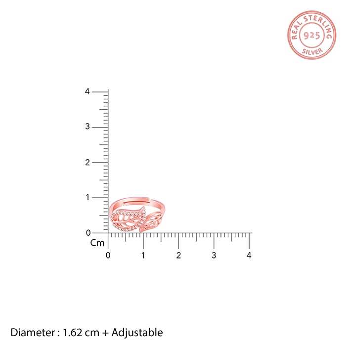 It features two leaf motifs on both ends of this open ring, in which one leaf is outlined with zircons.