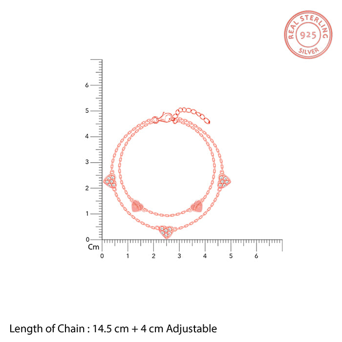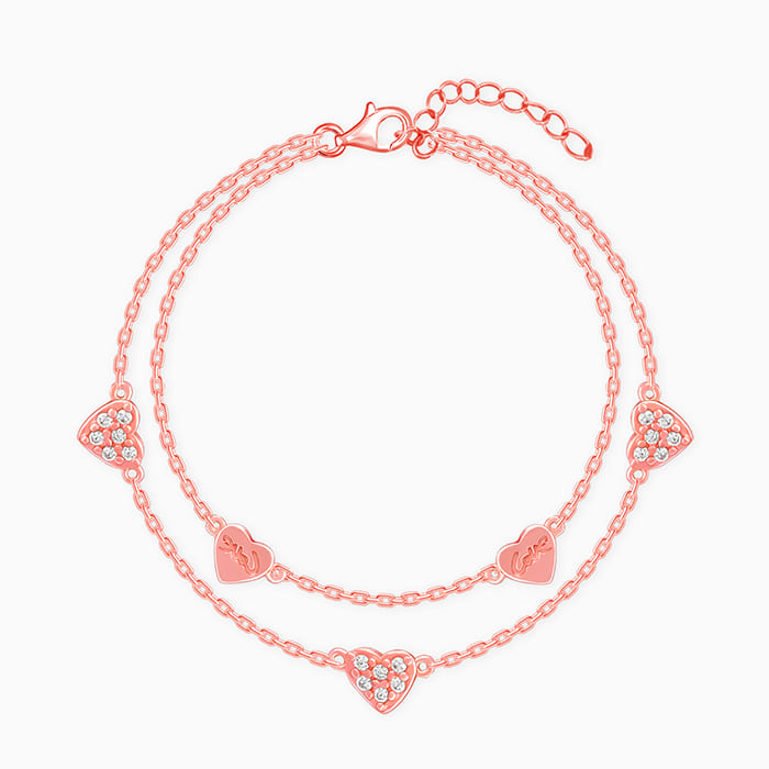 This rose gold bracelet features two layers, one with engraved heart designs and the other with zircon studded heart designs, all equally spaced.