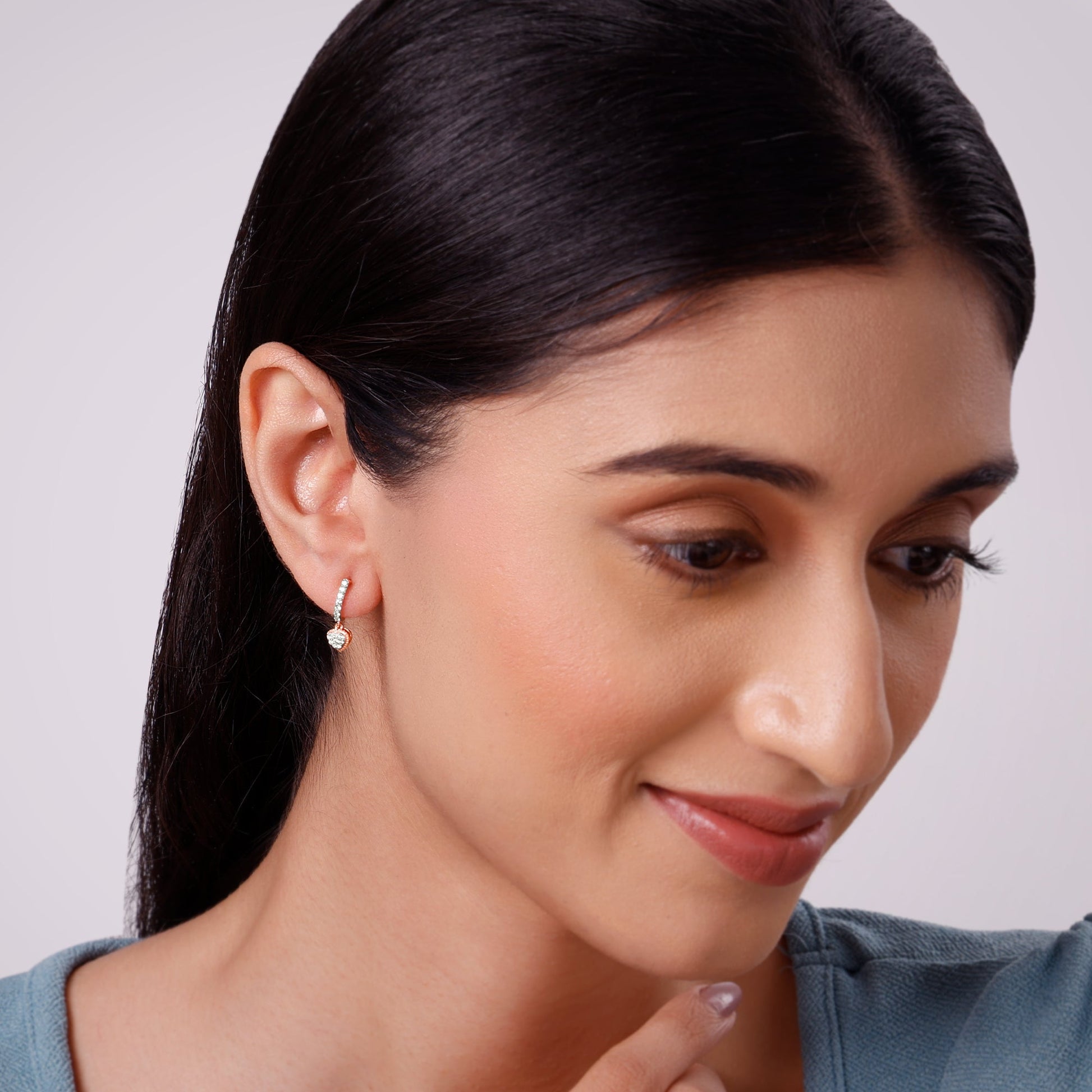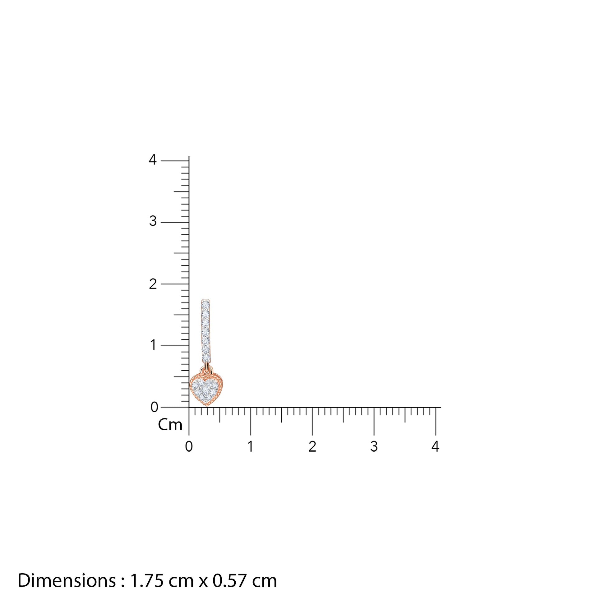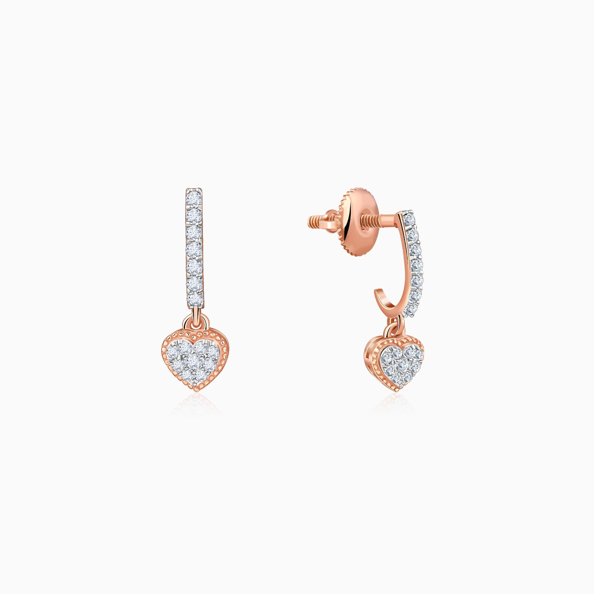 These pure rose gold earrings for women feature a sleek J-hoop design, with lab grown diamonds. A diamond-studded heart-shaped motif dangles below.