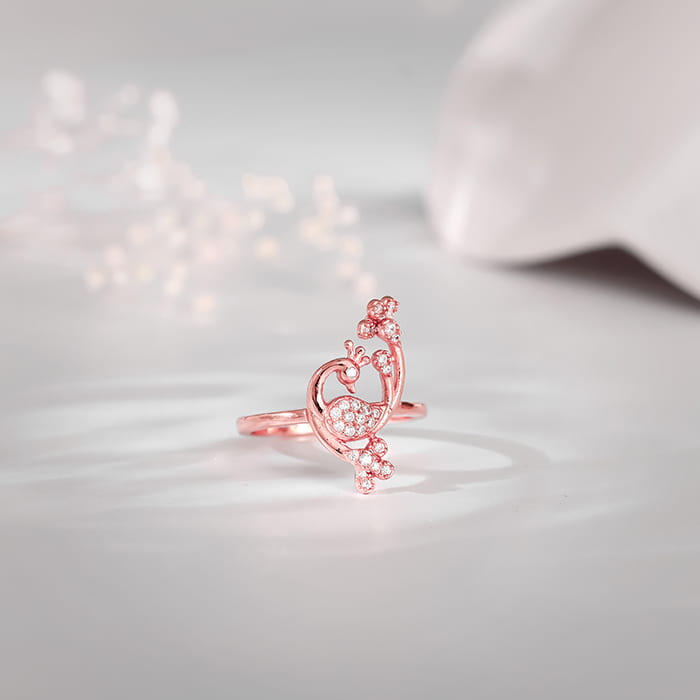 This rose gold ring features a peacock motif studded with zircons. Celebrate the timeless beauty of Indian textiles with Trendy Freak's latest 'Magic of Tradition' collection. Wear and celebrate tradition, anytime.
