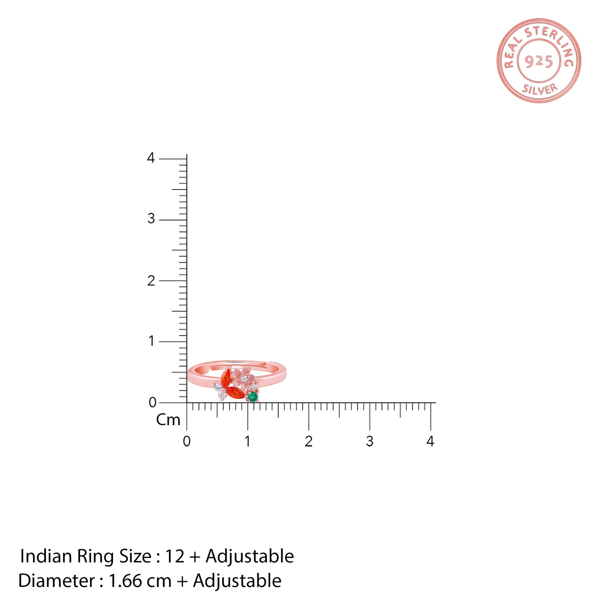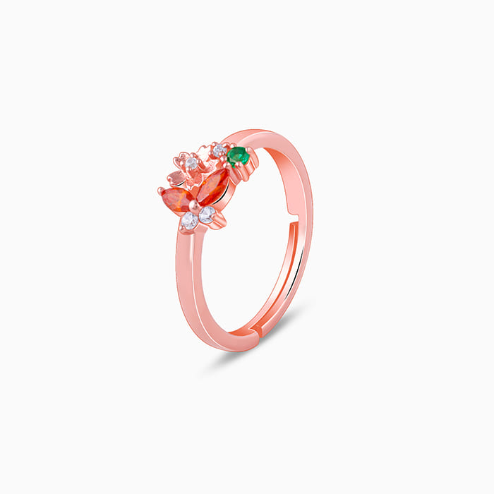 This rose gold ring for women features a whimsical floral butterfly design with coloured stones. It is accented with sparkling zircon for a delicate, feminine touch.