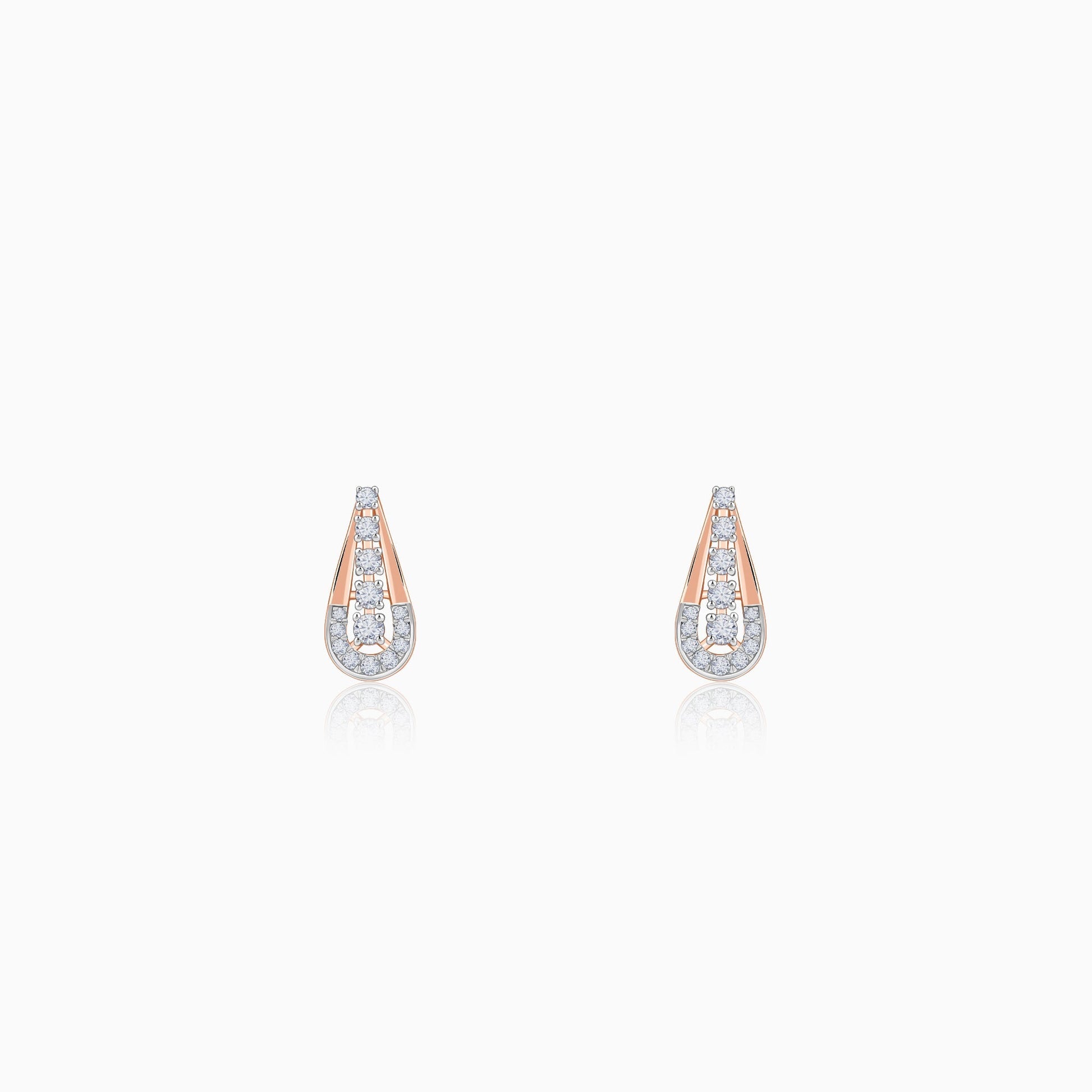These pure rose gold earrings for women feature a teardrop-shaped design with an open gold frame. The inner and outer edges are lined with rows of brilliant lab grown diamonds.