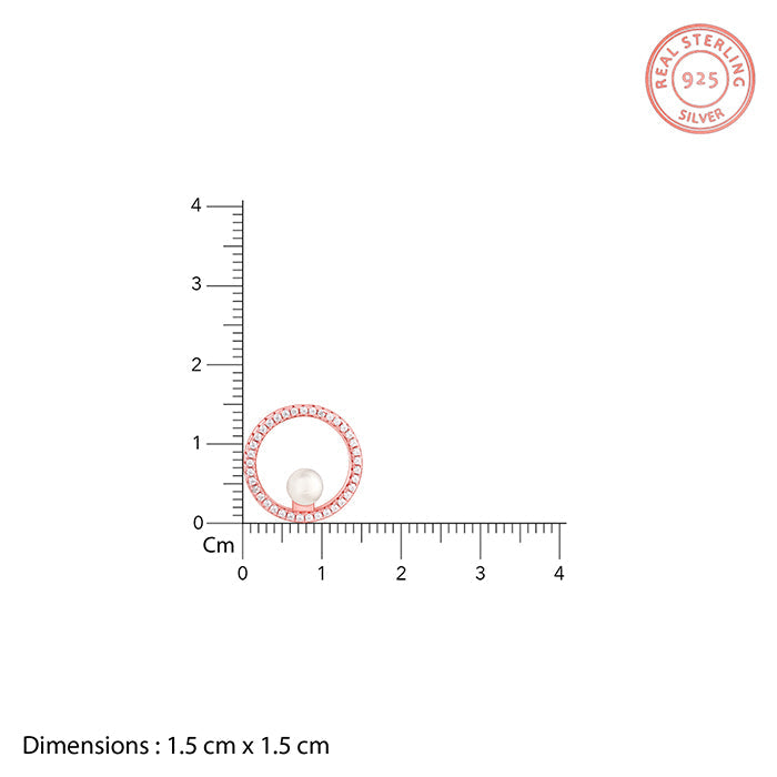 These rose gold plated earrings for women feature a hollowed-out, sleek circular motif studded with zircons. A single pearl sits within the circle, slightly above the lower base of the circle.