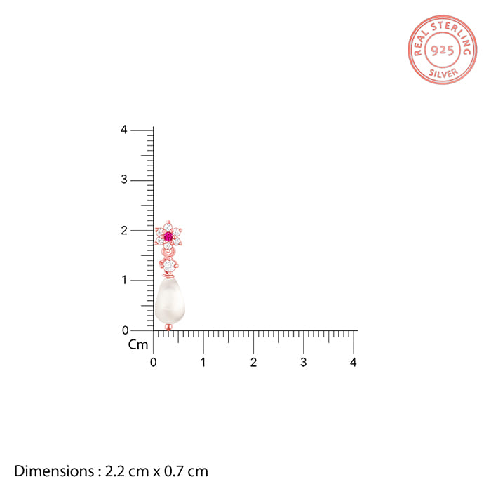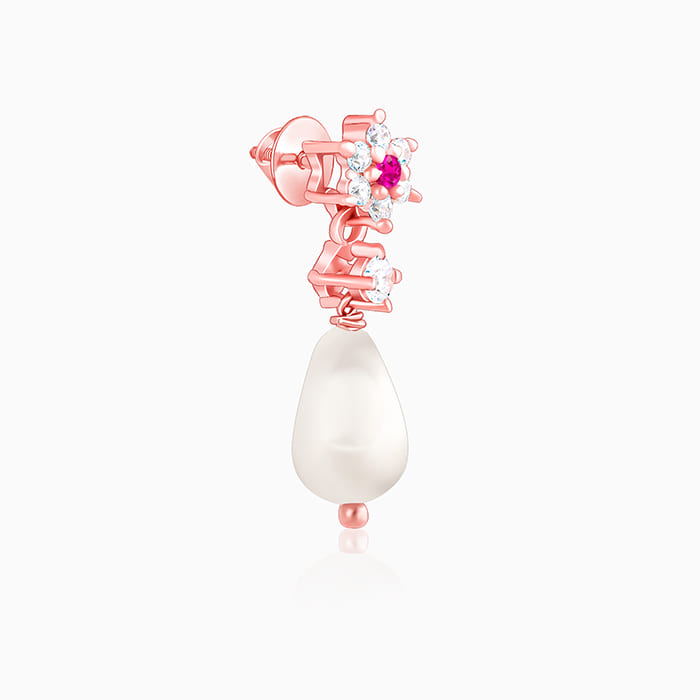 These rose gold earrings feature a flower motif with colourless zircons studded around a pink-coloured one. A small zircon is placed below it followed by a dangling pearl.