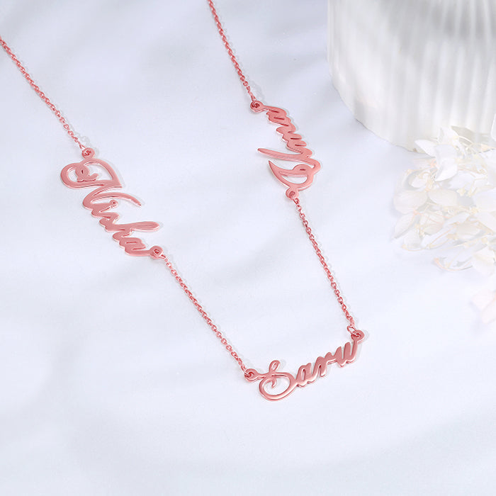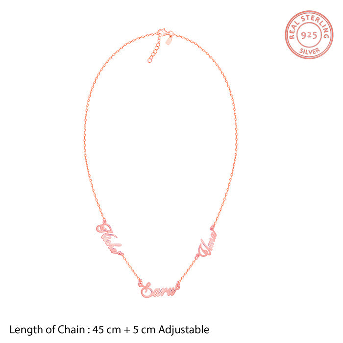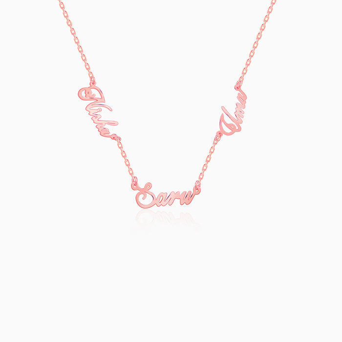 This personalised rose gold necklace for women features three names adjacent to one another.
