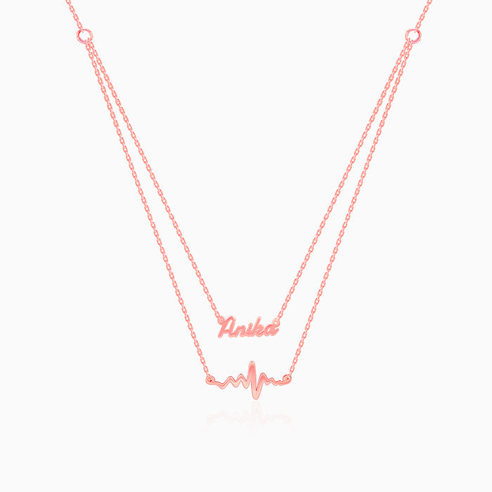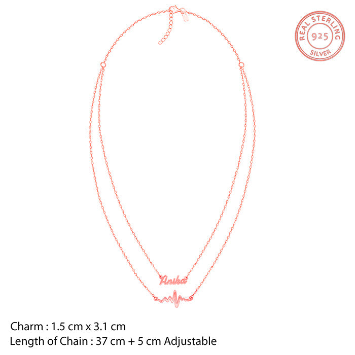 This personalised rose gold plated necklace for women features a dual-chain design—one layer showcasing a custom name and the other highlighting a sleek heartbeat motif. The elegant script font and minimal detailing give it a luxe finish, while the rose gold plating ensures a radiant shine. It’s a unique blend of personalised jewellery and expressive design—perfect for gifting or self-love.