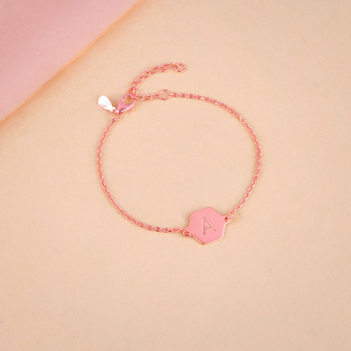 This rose gold plated personalised bracelet for women features a sleek golden chain with an adjustable lobster clasp closure. At its centre sits a polished hexagonal charm in a matching gold tone, engraved with the initial of your choice. Minimalist yet elegant, it’s perfect for everyday wear or as a thoughtful, personalised gift.