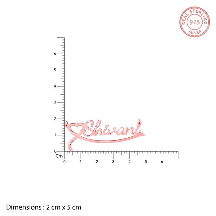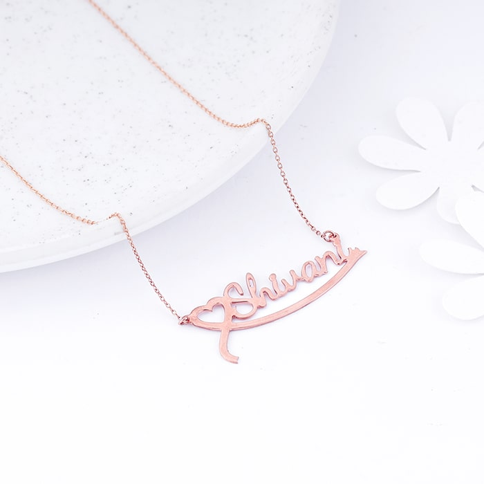 This custom-made rose gold pendant features a heart motif at the beginning of the name you choose to personalise.