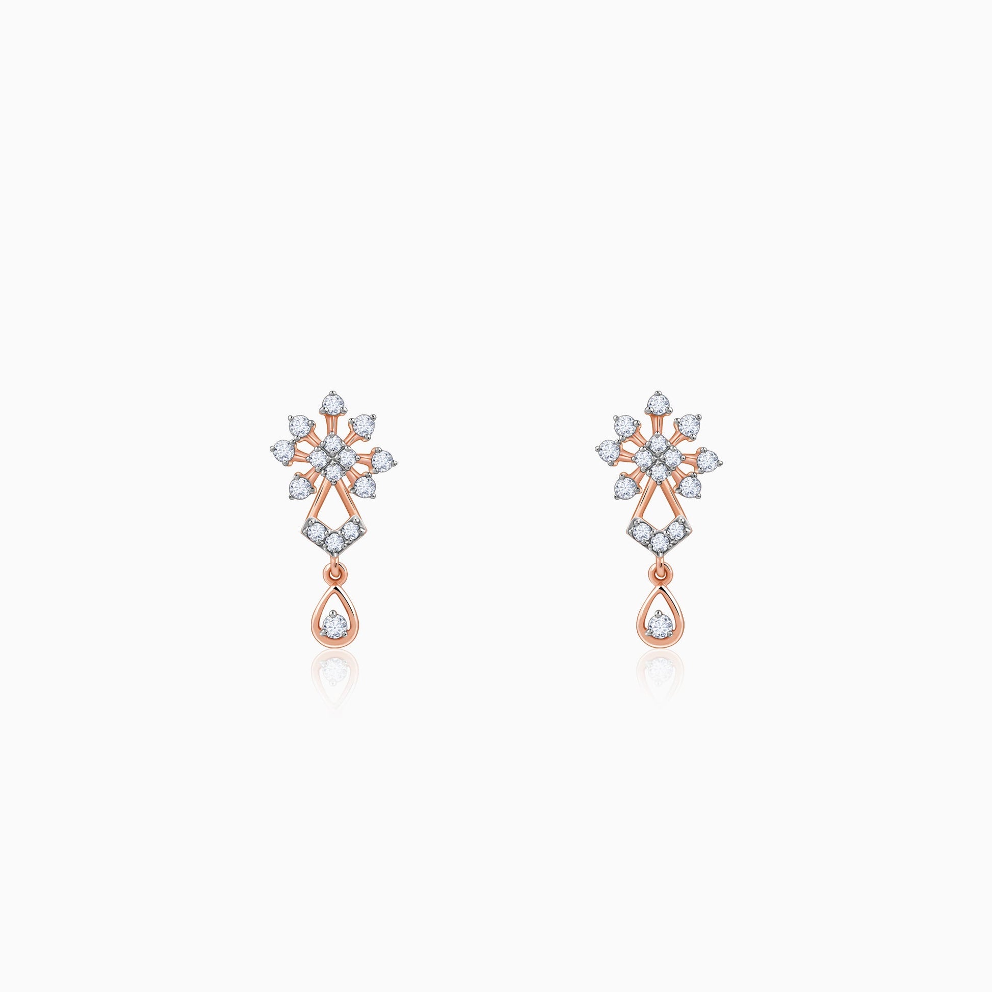 These pure rose gold earrings for women feature a floral design with a central cluster of square-shaped lab grown diamonds. Additional diamonds are set around it in a radiating pattern, creating an elegant, sparkling drop style.