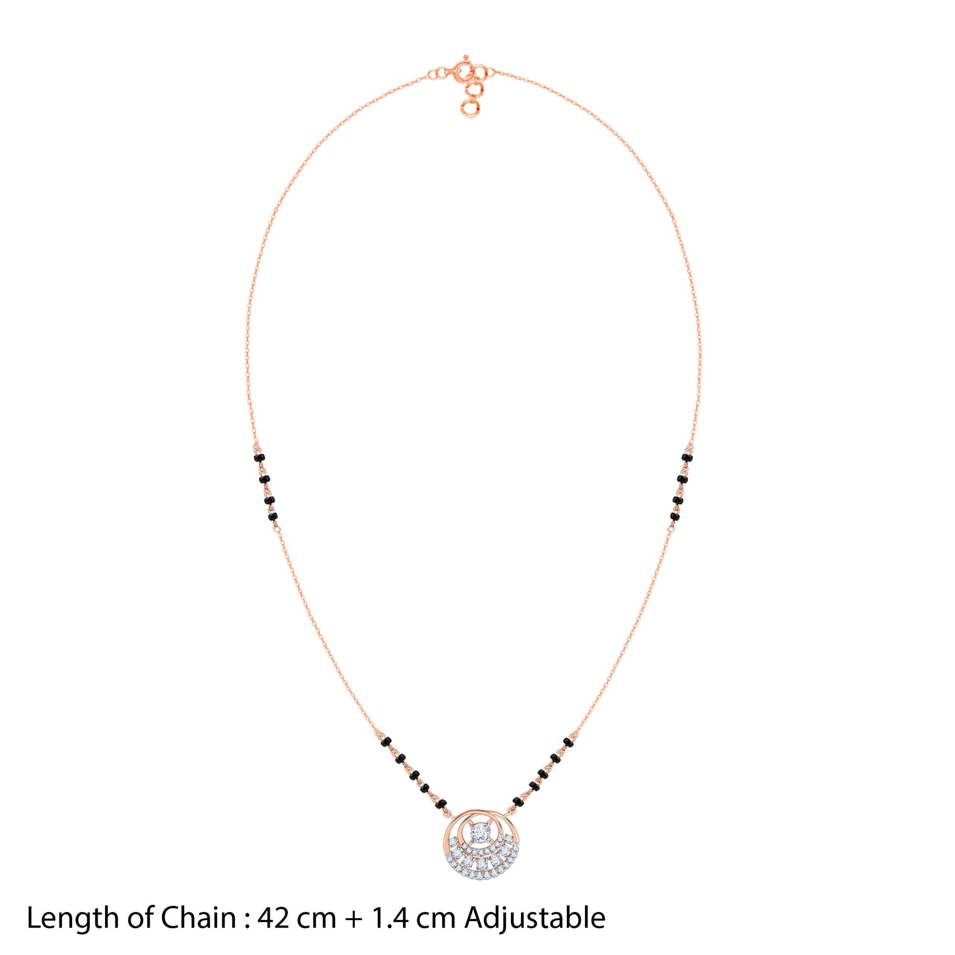 This pure rose gold mangalsutra for women features black beads along the chain and a circular design. It's studded with layers of lab grown diamonds in a concentric pattern.
