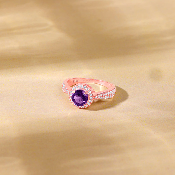 This silver womens ring showcases a natural, circular-shaped amethyst stone at the centre, surrounded by a halo of smaller clear accent zircons. The band is also set with zircons on its shoulders.. From nature’s heart to yours - Trendy Freak's natural Gemstone Collection makes every occasion special, whether you’re gifting a loved one or treating yourself.