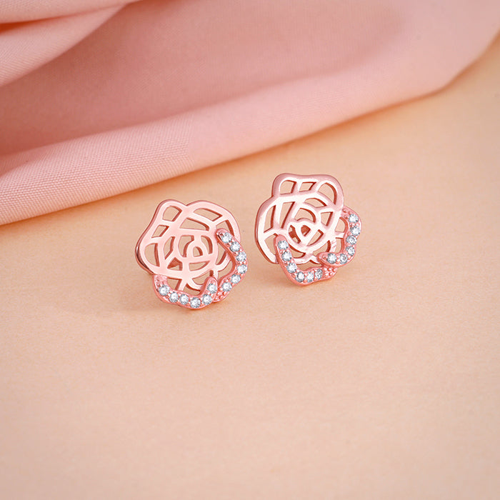 These rose gold plated earrings for women have a bloomed rose-like motif with a solid filigree pattern filling the petals. A row of zircons partially accentuates two of the petal edges on the outer side.