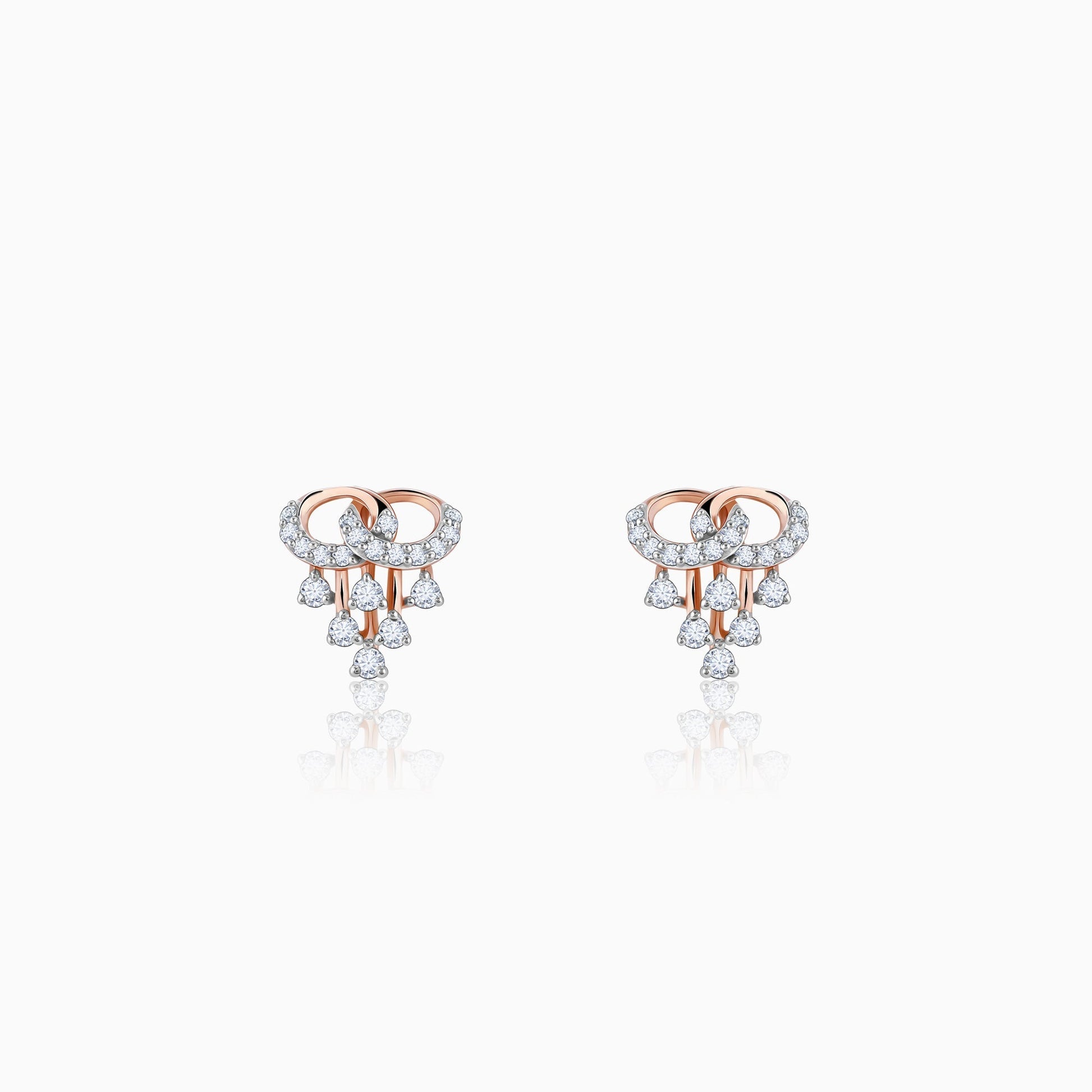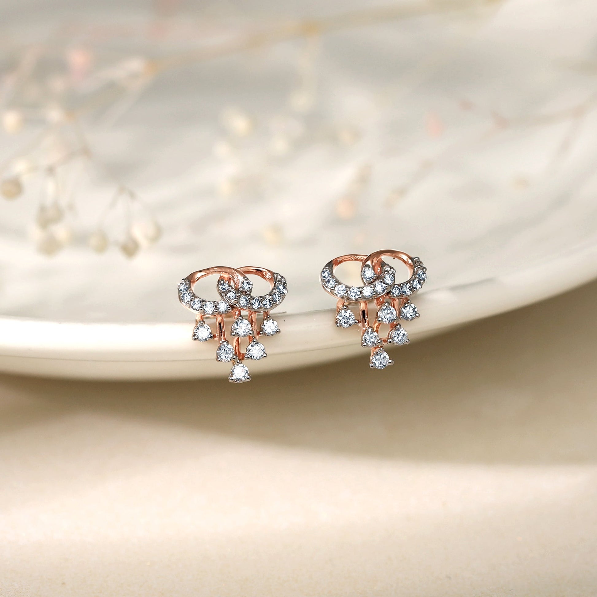 These pure rose gold earrings feature two circular motifs interconnected with dangling lab-grown diamonds.