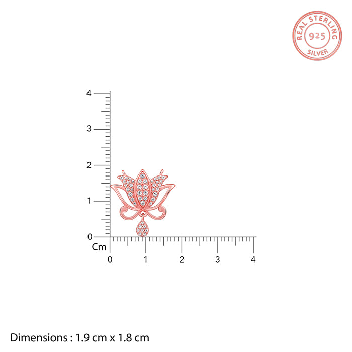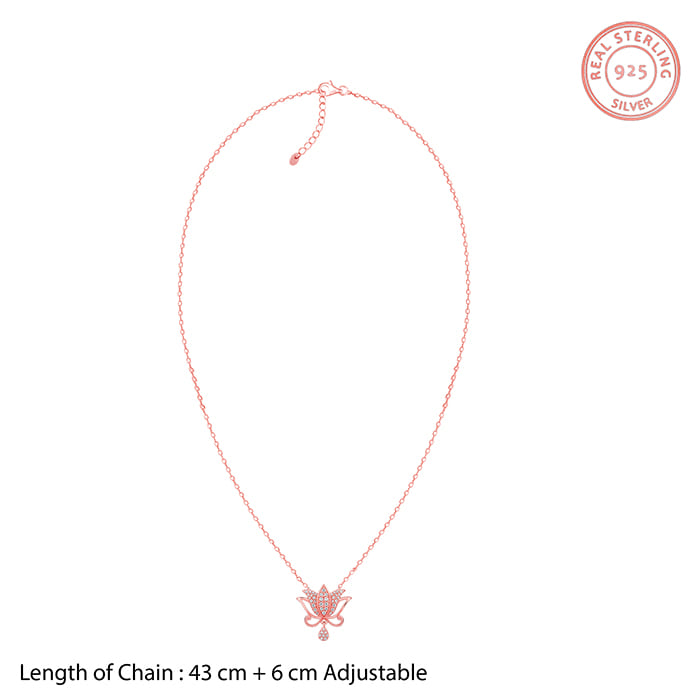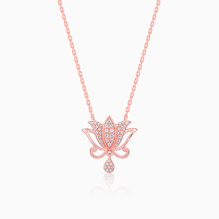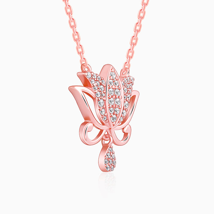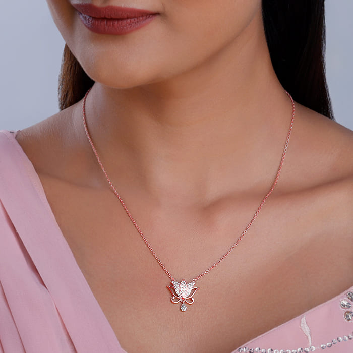 This rose gold necklace features a lotus motif, with shimmering zircons and a graceful drop zircon. Celebrate the timeless beauty of Indian textiles with Trendy Freak's latest 'Magic of Tradition' collection. Wear and celebrate tradition, anytime.