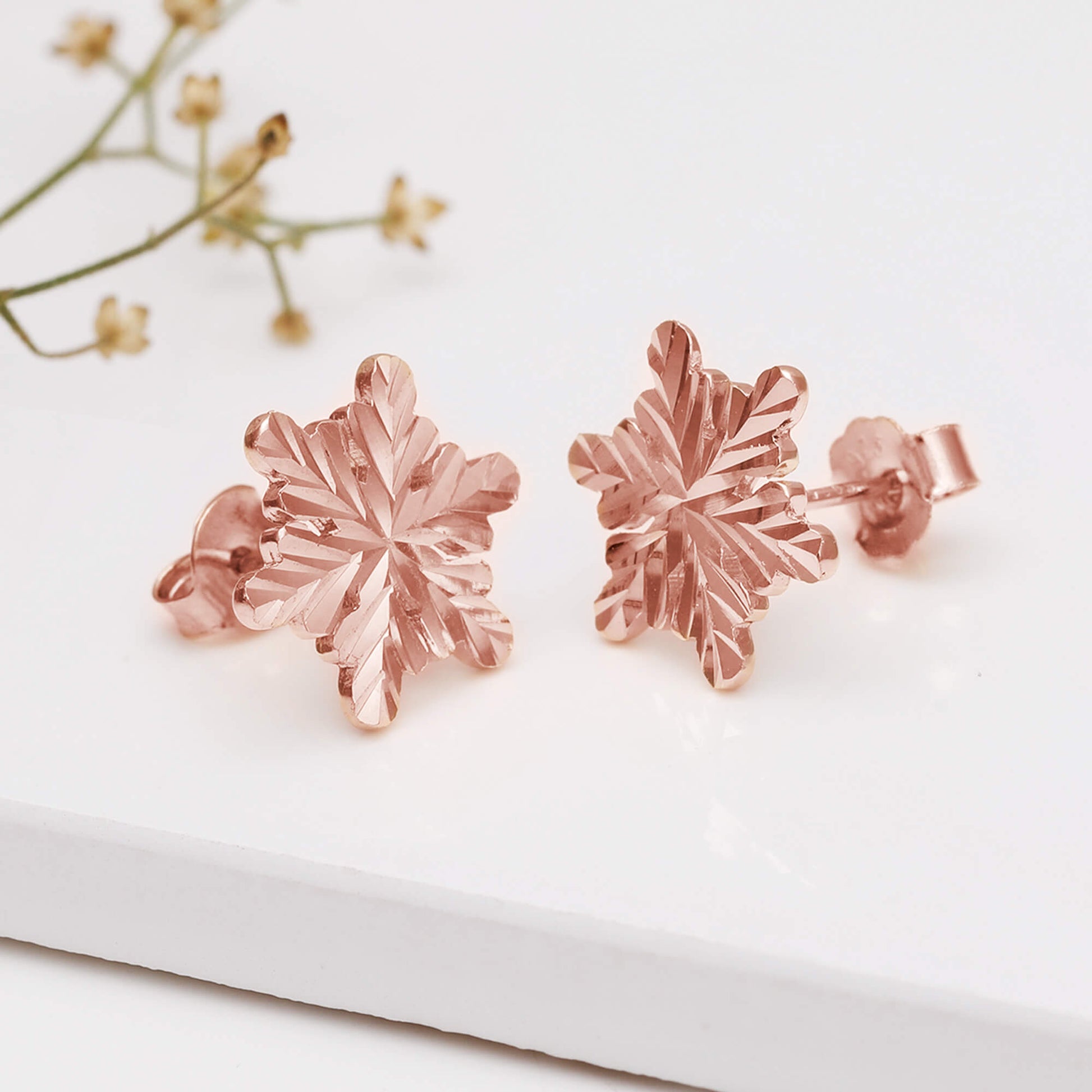These Rose Gold Snowflake Studs are handcrafted with love, just for YOU! A captivating beauty is crafted in rose gold, reminiscent of a snowflake making its gentle journey. A marvellous sight indeed.