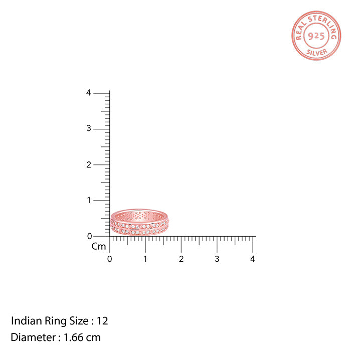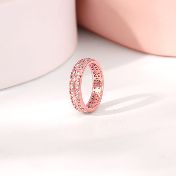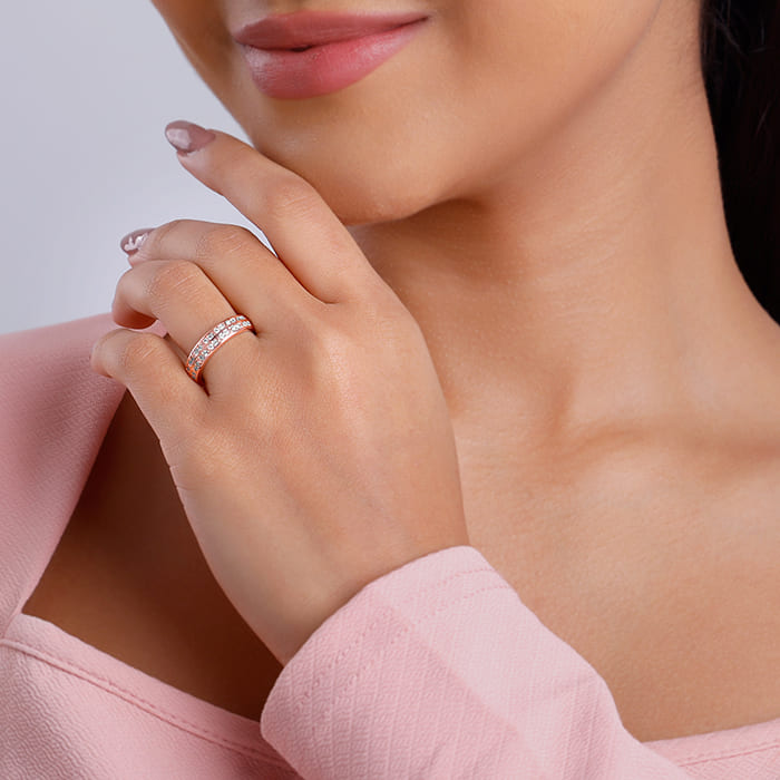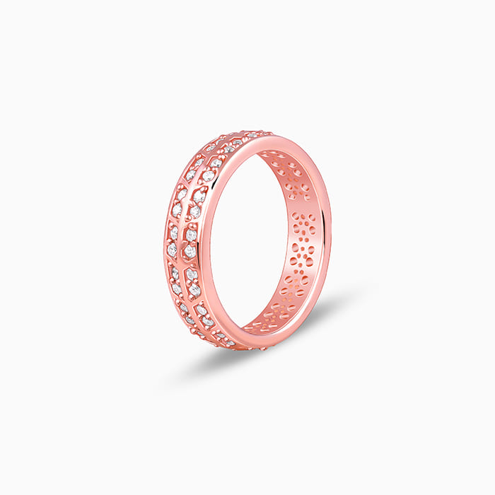 This rose gold plated ring for women features a flat band with intricate details separated by a rim. The design is accentuated by zircons studded around its circumference.