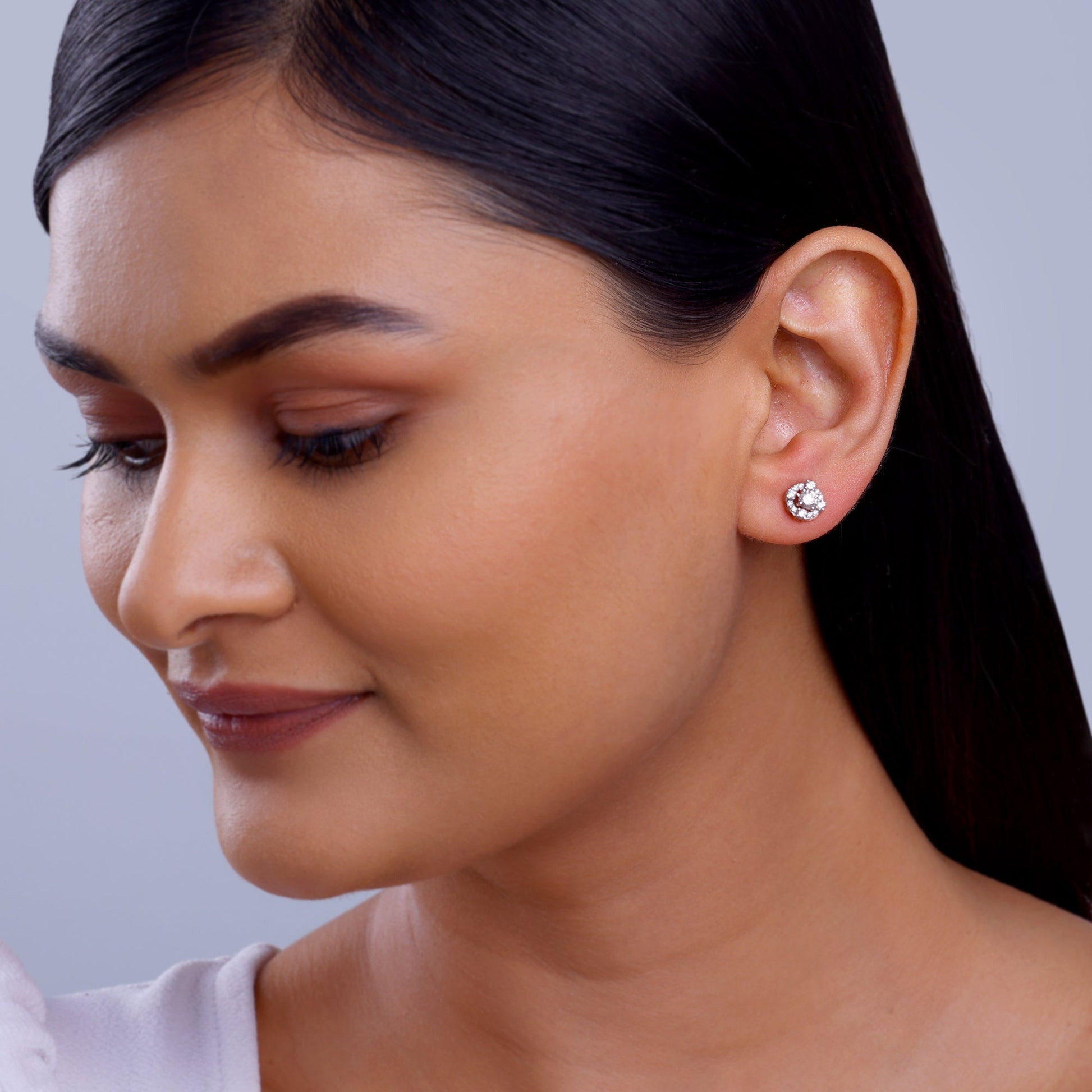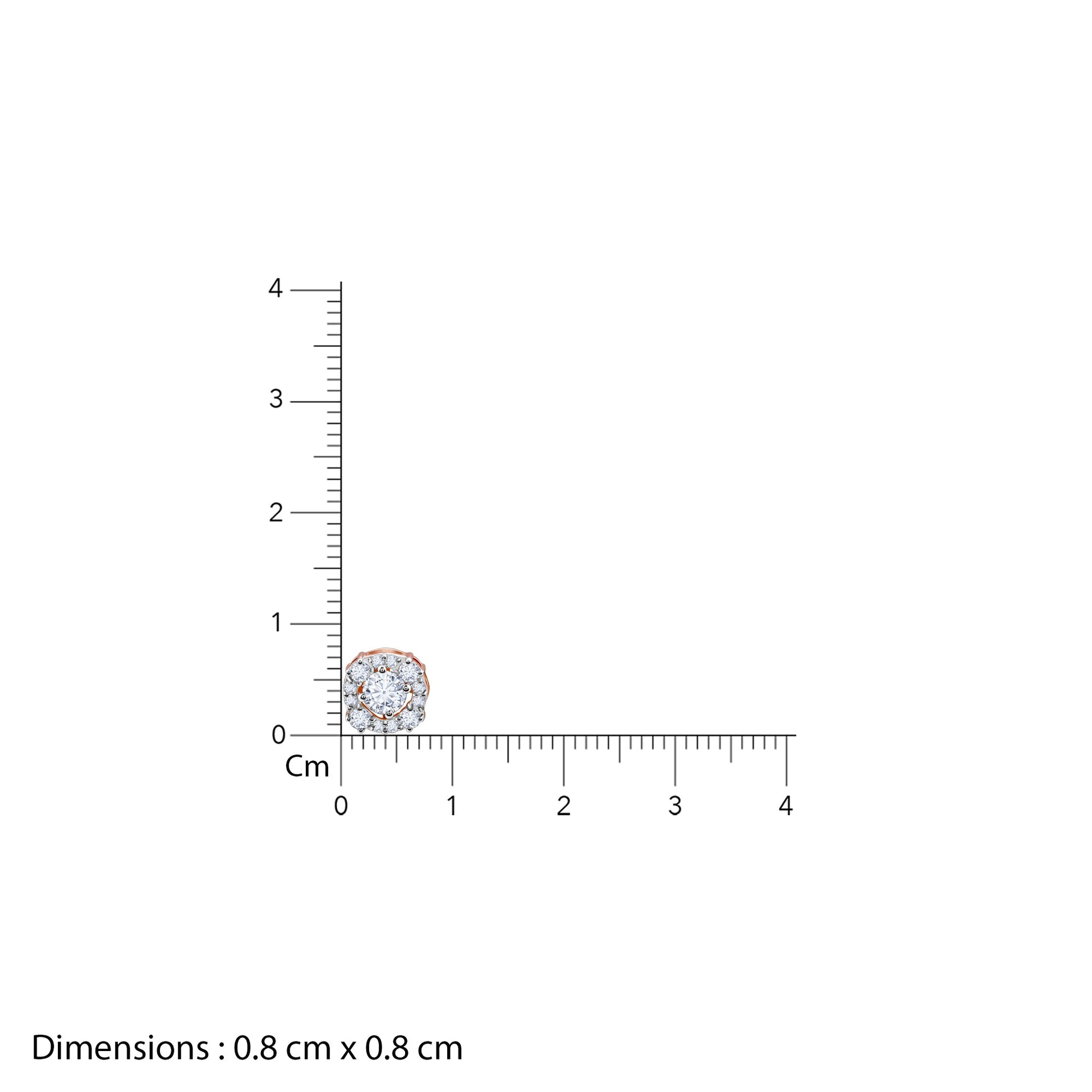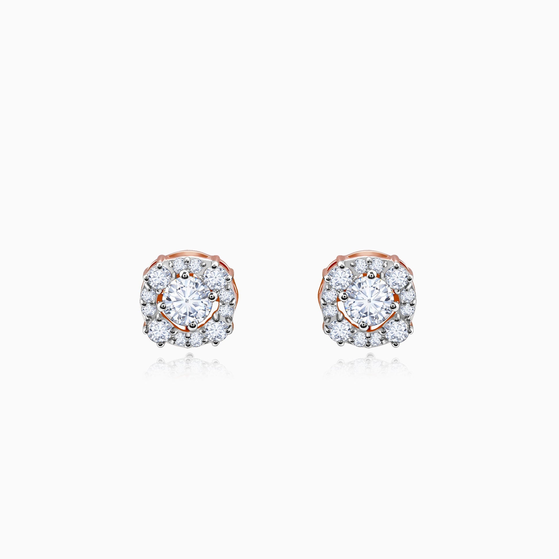These rose gold stud earrings for women feature a circular shape with lab grown diamonds in a halo setting and a single diamond at the centre.