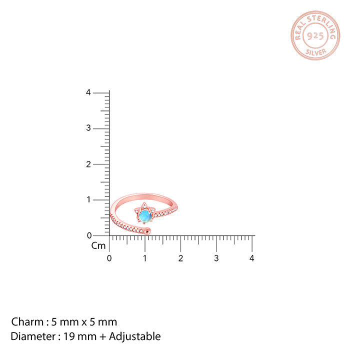The Rose Gold open-ended ring has a blue stone as the centrepiece and the rim is studded with zircons.