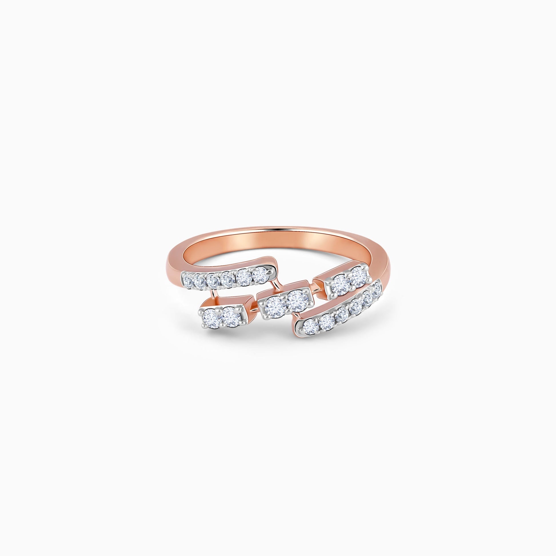This pure rose gold ring features a unique, asymmetrical shape with lab grown diamonds arranged in a linear pattern.