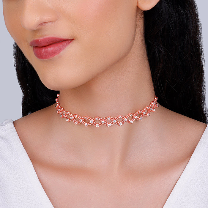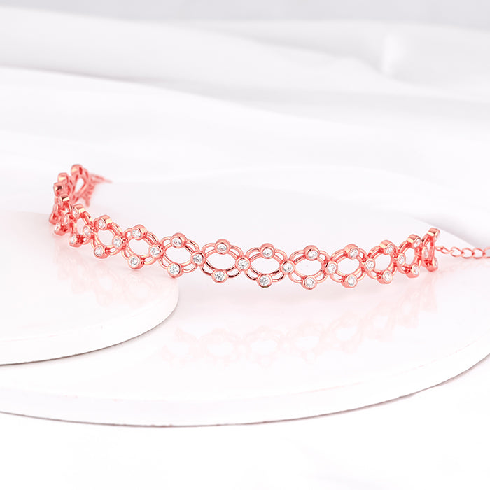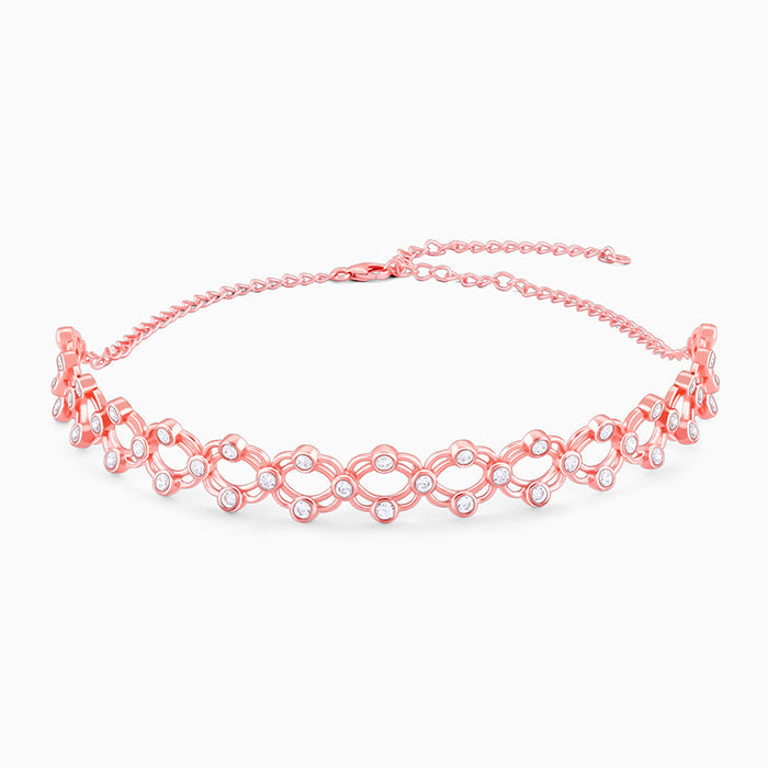 This rose gold necklace features an oval motif with four zircons placed on it.