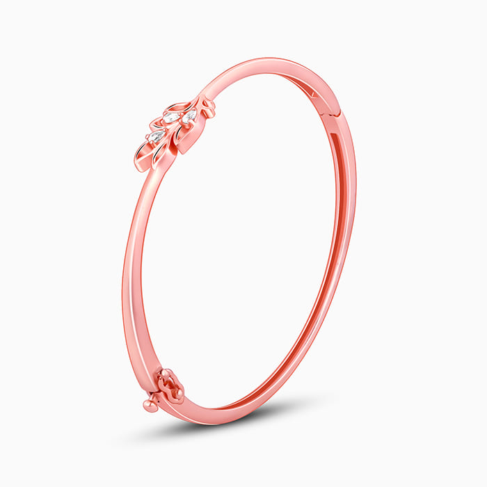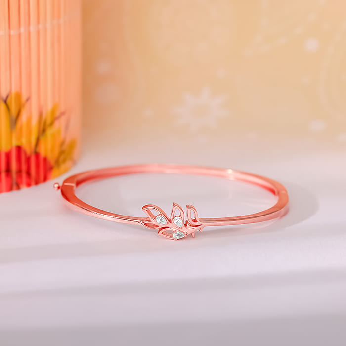 This rose gold bracelet features a feather motif studded with zircons. Celebrate the timeless beauty of Indian textiles with Trendy Freak's latest 'Magic of Tradition' collection. Wear and celebrate tradition, anytime.
