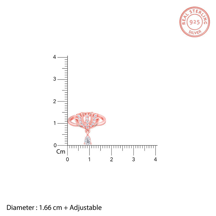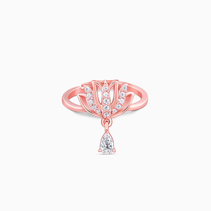 This rose gold ring features a lotus motif studded with zircons and a drop of zircon dangling below. Celebrate the timeless beauty of Indian textiles with Trendy Freak's latest 'Magic of Tradition' collection. Wear and celebrate tradition, anytime.