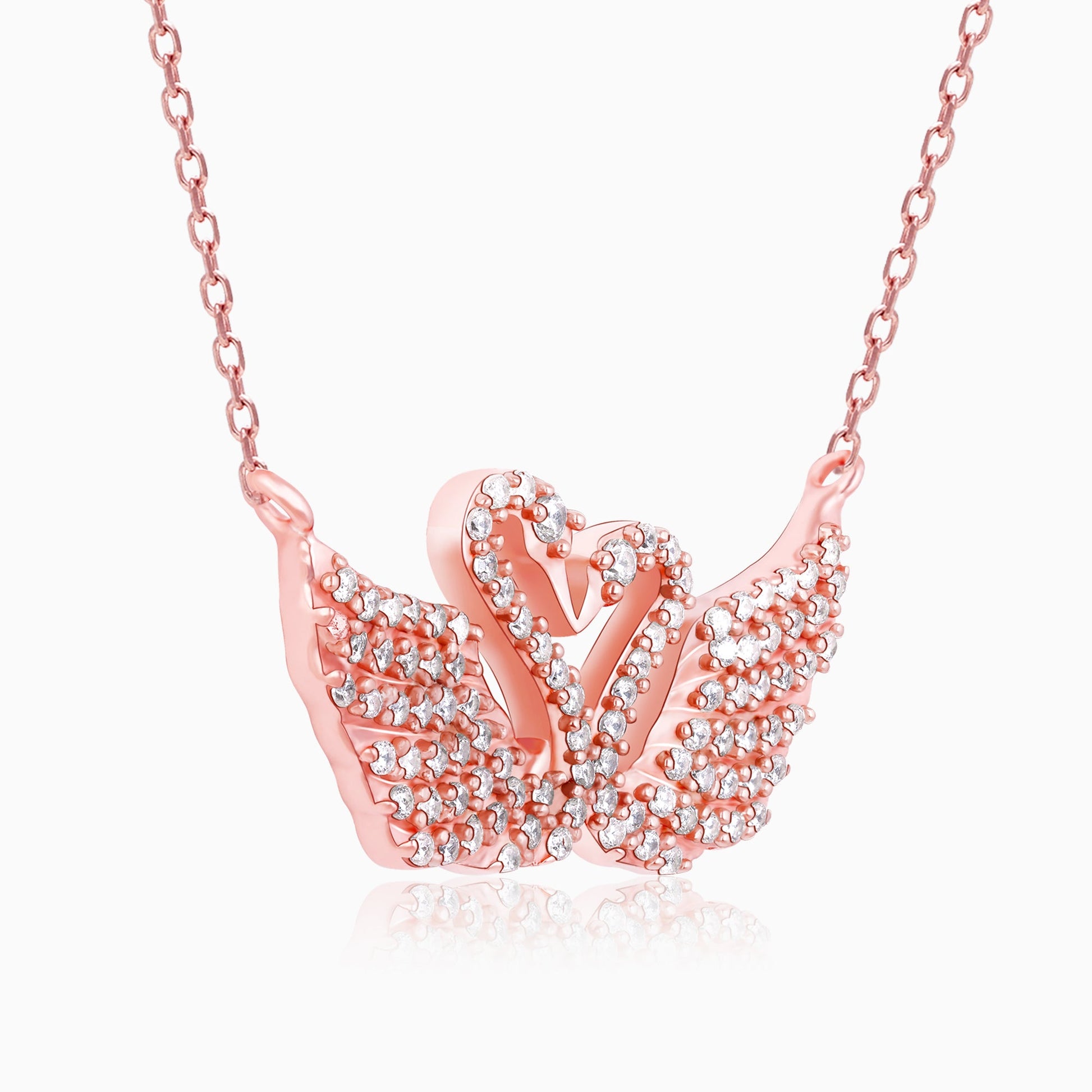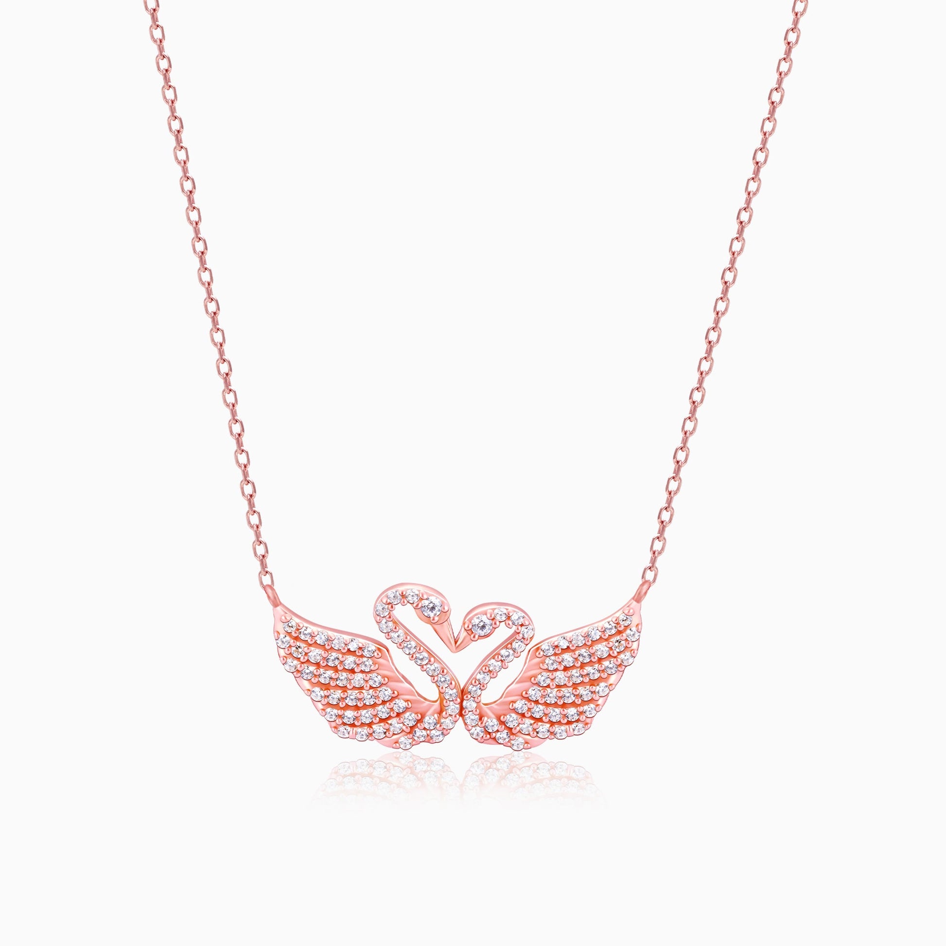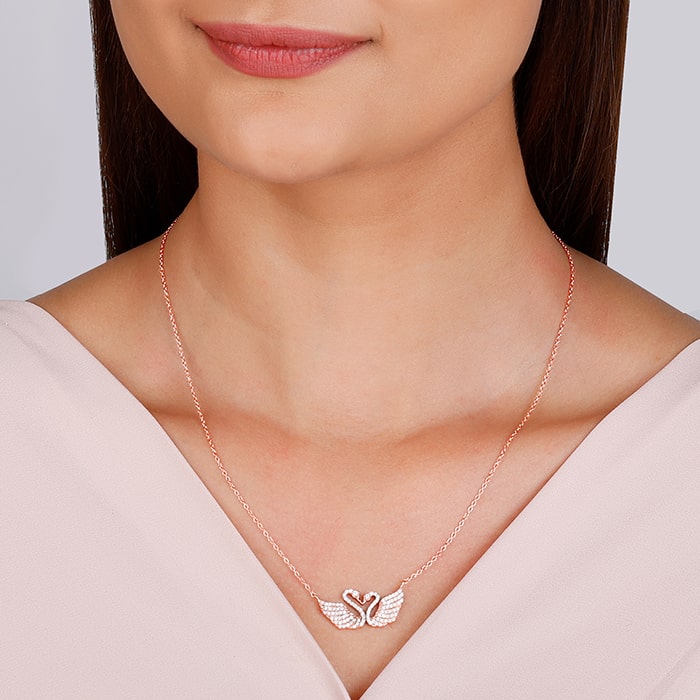 The rose gold necklace features two swans at the centre forming a heart shape and zircons studded on their feathers.