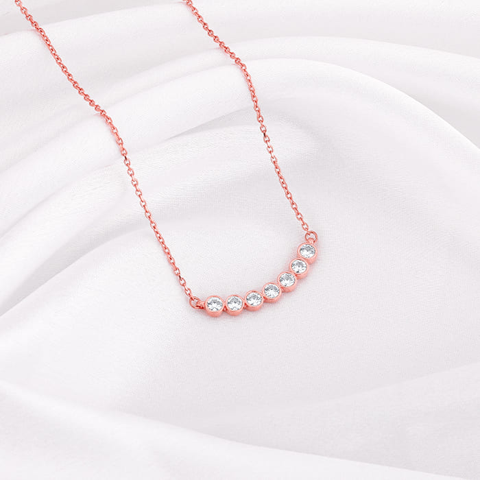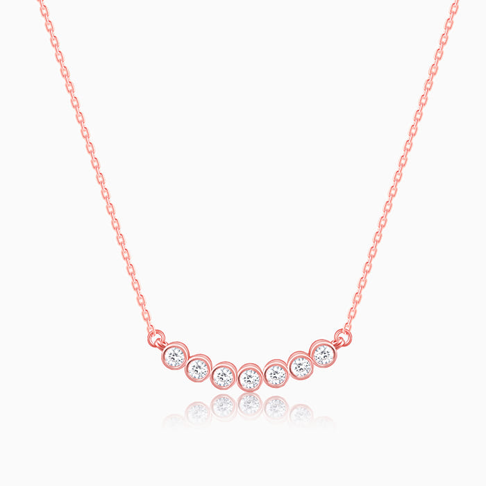 This rose gold necklace features a series of circular motifs nestling zircons.