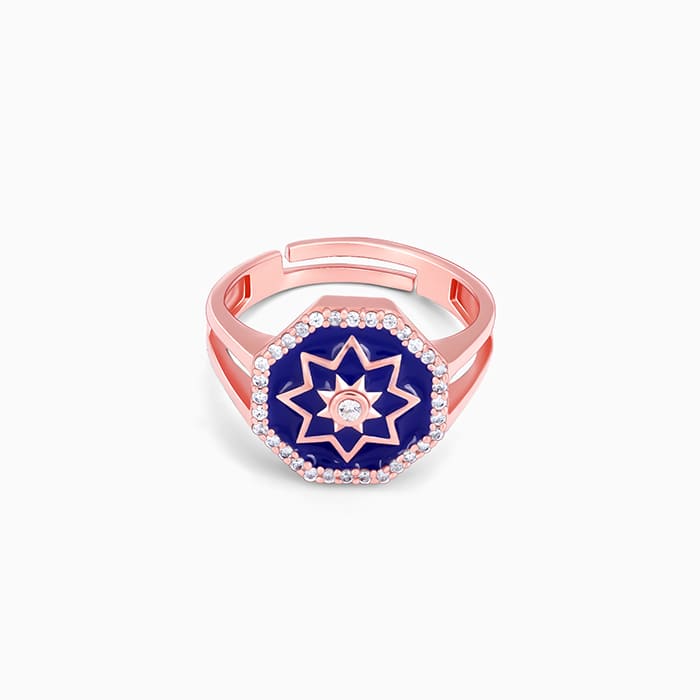 The rose gold ring features a hexagonal design with blue enamel studded with zircons.