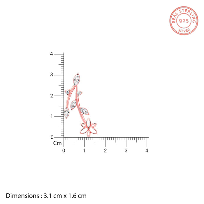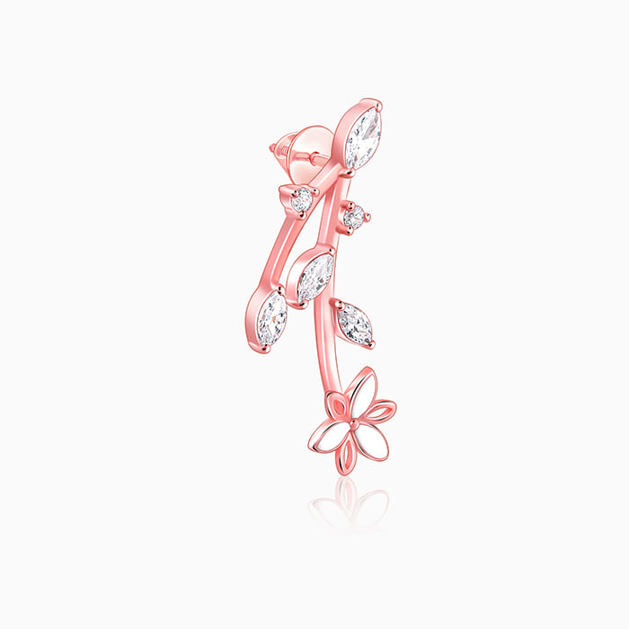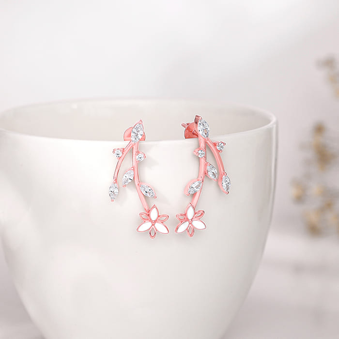 Crafted in rose gold-plated, these earrings draw inspiration from the trillium flower, featuring zircons in the form of leaves and enamel detailing on the flower. Celebrate the beauty of nature's rarest blooms with Trendy Freak and Bhumi Pednekar - The Bhumi Collection.