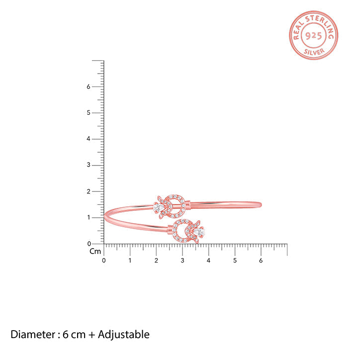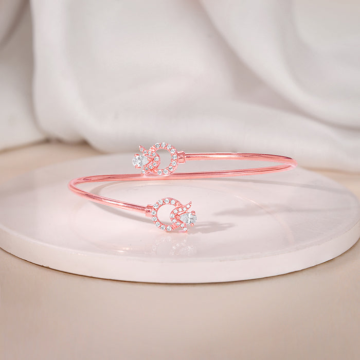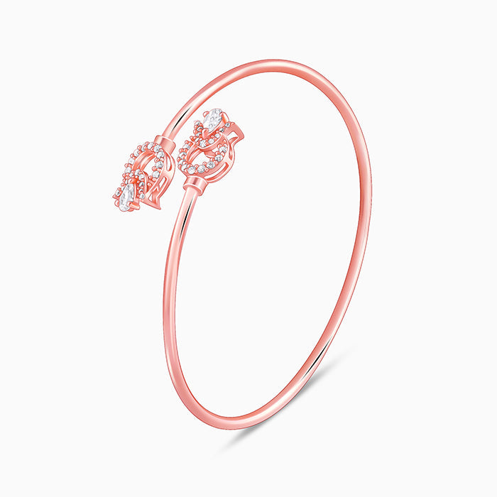 This rose gold plated cuff bracelet for women features open ends, each capped with a stylised tulip motif f studded with sparkling zircons.