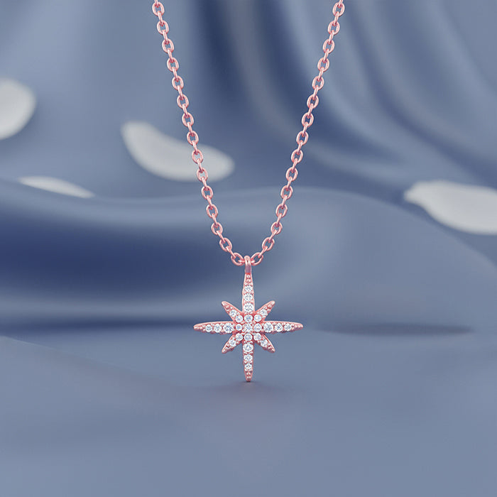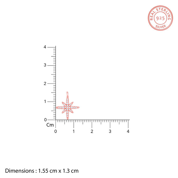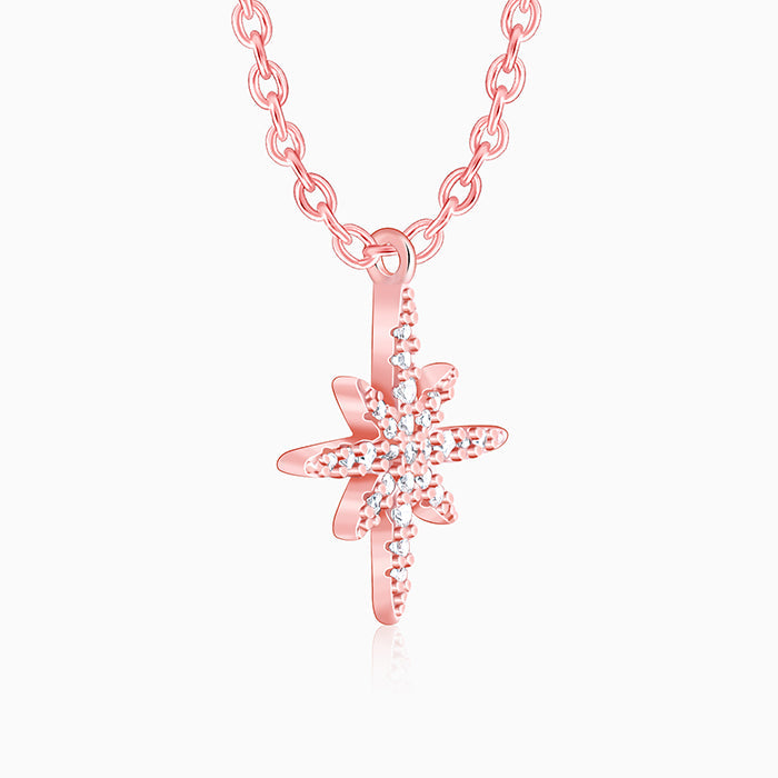 Shine as brightly as a celestial body with this guiding light design. Crafted in a warm rose gold-plated finish, the starburst pendant is fully set with zircons that capture the dazzling sparkle of a clear night sky.