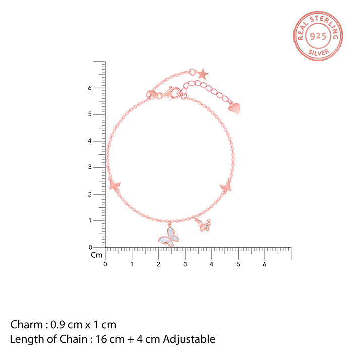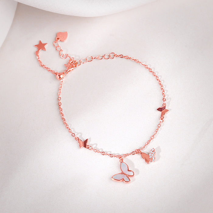 This rose gold plated bracelet for women features dangling butterfly motifs in varying sizes. Two additional butterfly motifs are placed along the band.