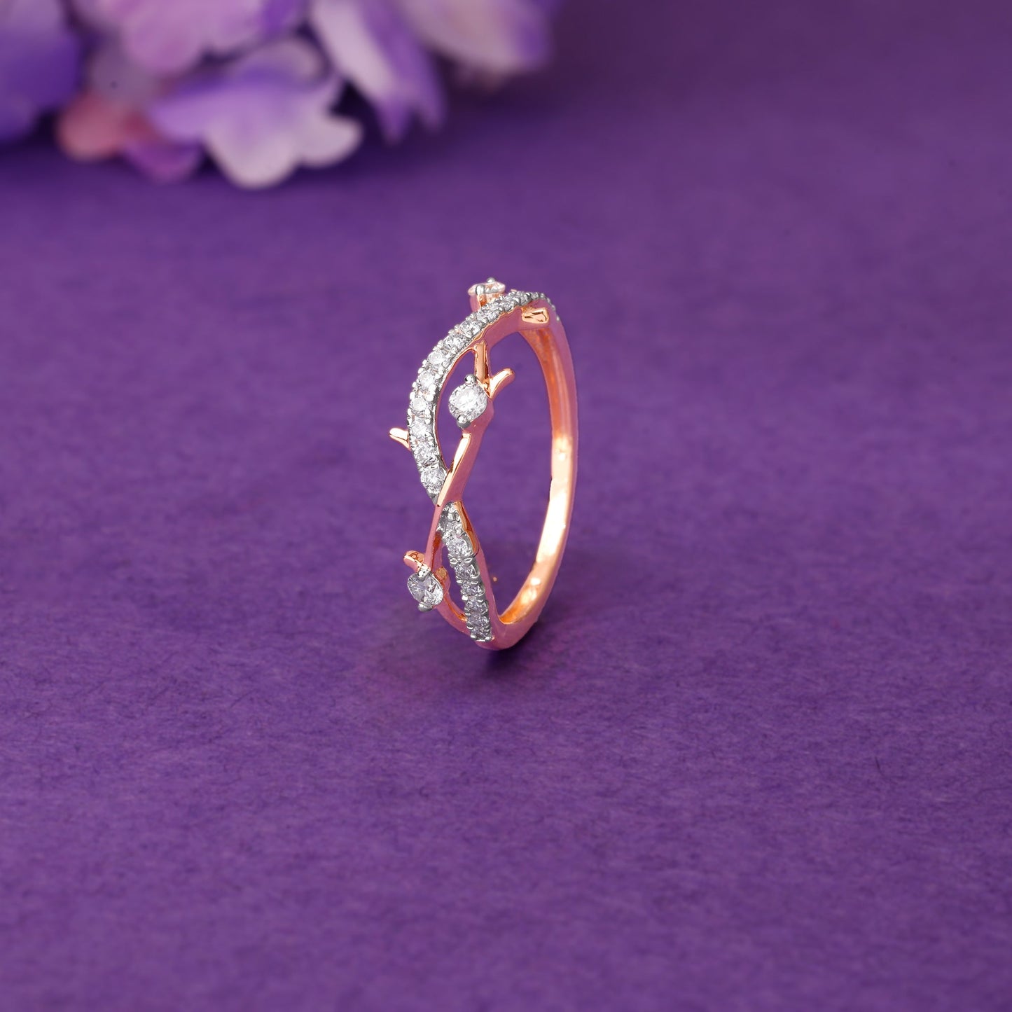 This rose gold ring for women features a branch-inspired design, with one branch lined in sparkling lab grown diamonds. A single lab diamond sits at the intersection, creating a striking focal point in this nature-driven silhouette.