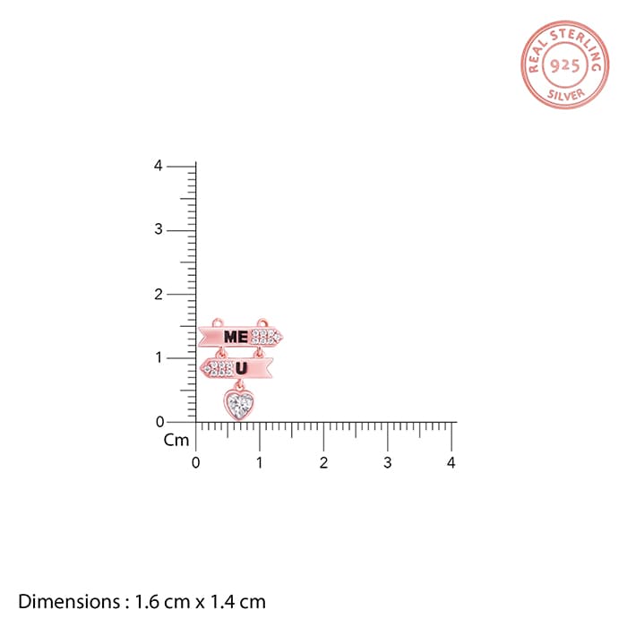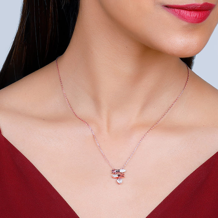 The rose gold necklace features an arrow design with both facing opposite to each other and a heart dangling at the end studded with zircons