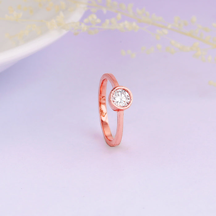 This rose gold ring features a circular design set with a single stone zircon.