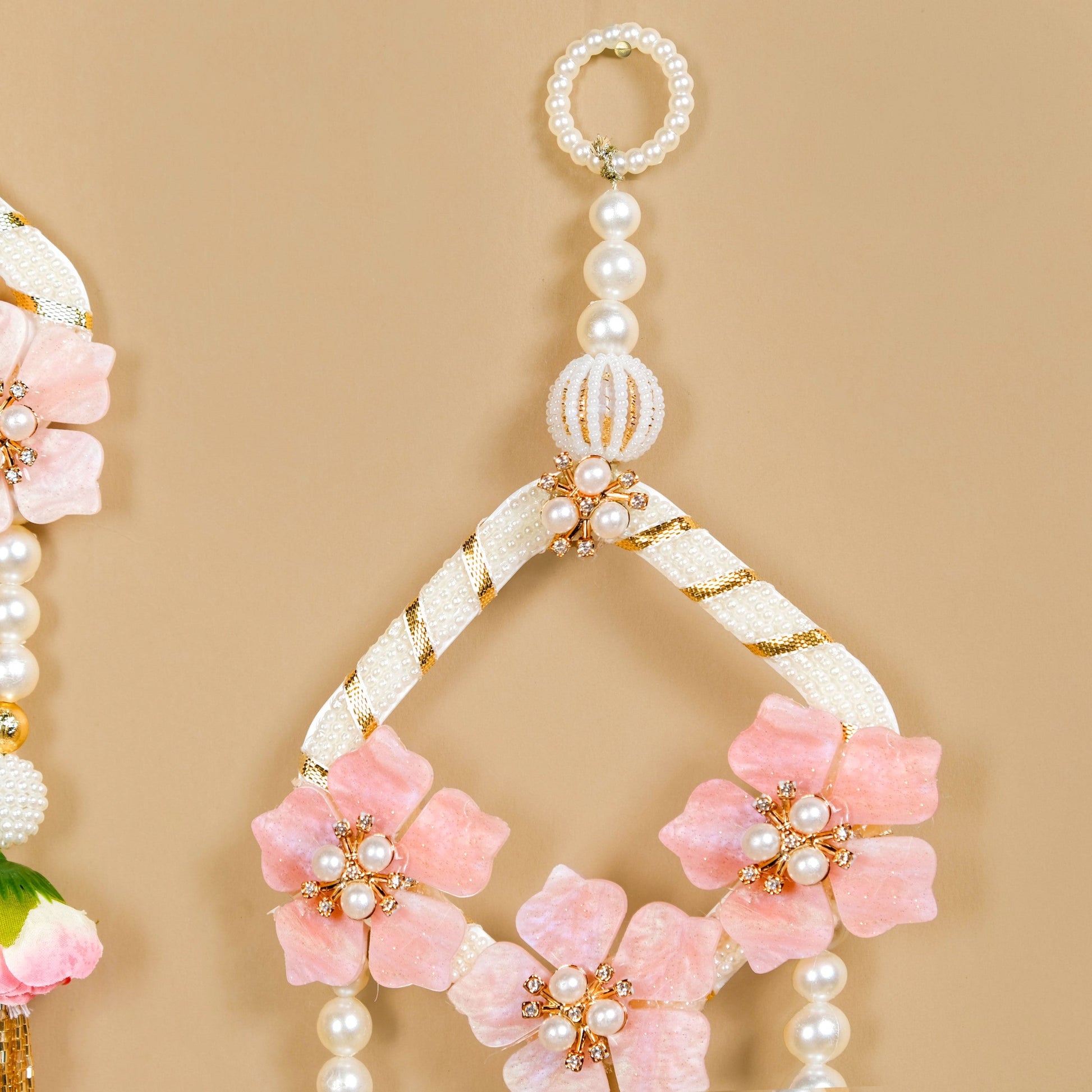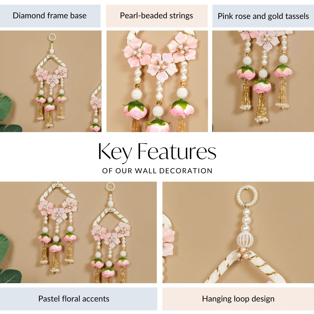 Design: Each door hanging is crafted with a diamond-shaped frame wrapped in golden ribbon, giving the structure a refined base. The symmetrical pair is embellished with delicate pastel floral accents and enhanced with pearl-beaded strings for decorative charm. Pink rosebud tassels finished with golden thread fringes and pearl detailing add vibrant movement. The design reflects intricate handmade craftsmanship, balancing glossy and matte textures within a multi-layered arrangement. Lightweight with a convenient hanging loop, this door hanging pair is both practical and visually striking, making it a versatile decorative accessory for special occasions.