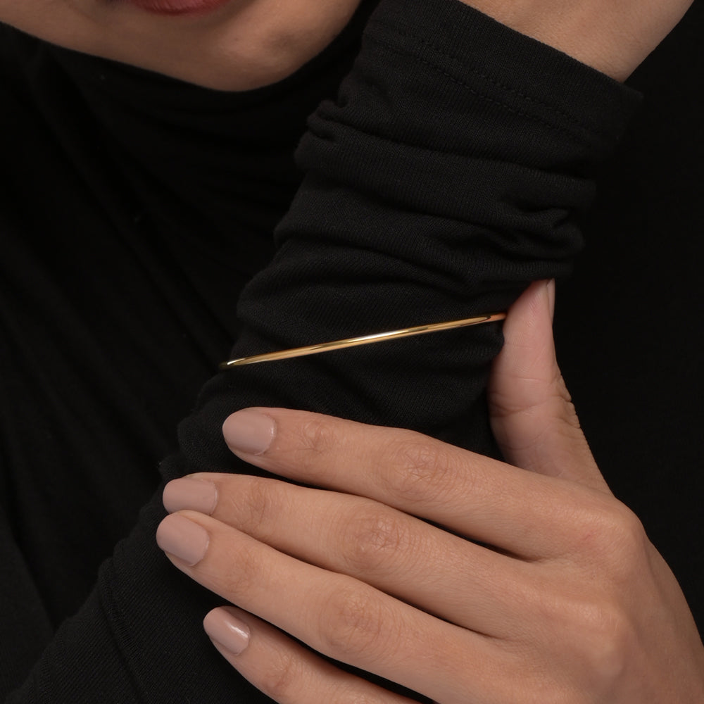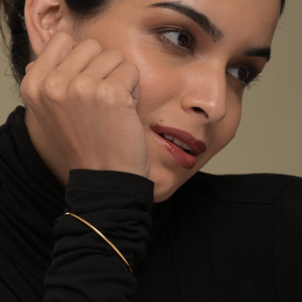 Round Wire Demi-Fine Bangle Bracelet brings a sleek yet timeless touch to your collection with its clean design and radiant finish. Crafted in stainless steel with a luxe 18k gold plating, this piece beautifully blends durability with elegance, making it a must-have in demi-fine jewellery. A versatile addition to your stack, it effortlessly transitions from casual days to glamorous nights, making it one of the most loved bracelets for women. Whether worn solo for a chic statement or layered for bold style, it’s the perfect choice among gold bracelets for women who love minimal luxury and gold plated jewellery.