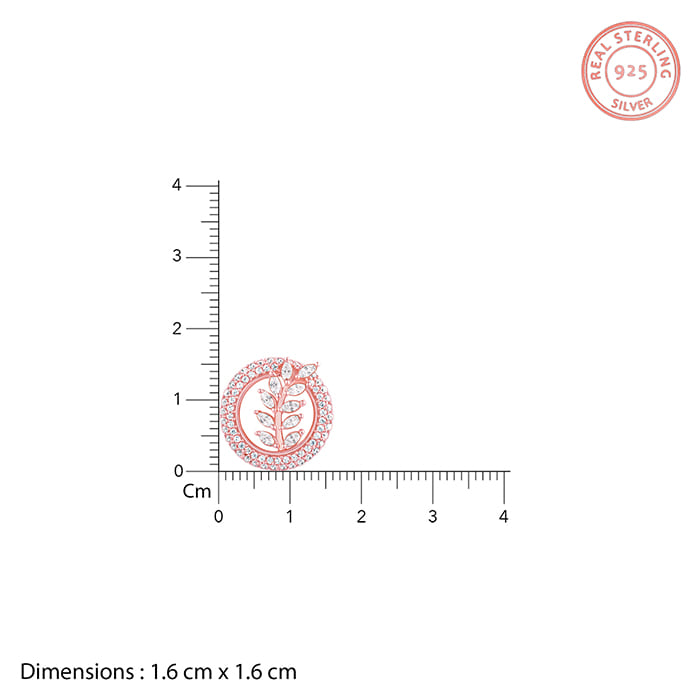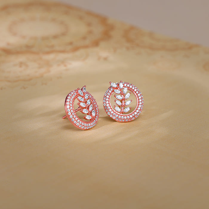 These rose gold earrings have a circle design with a leaf motif studded with zircons.