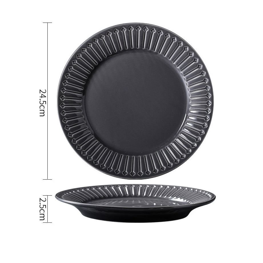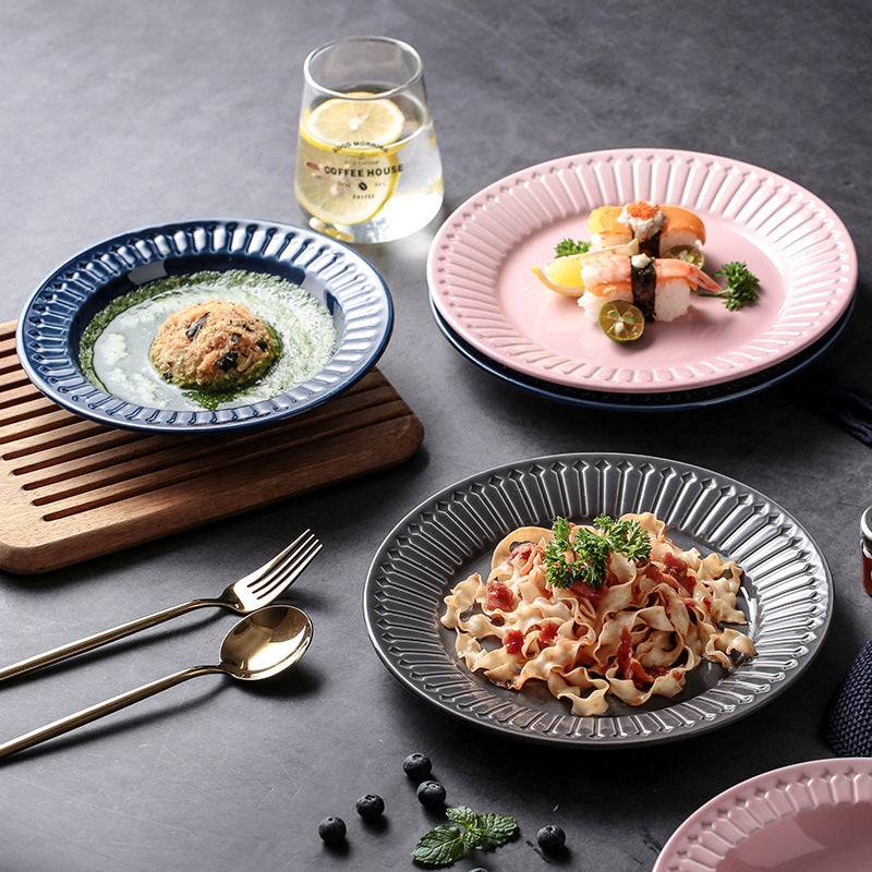 Nestip: Use the textured plate along with textured ceramic bowls and gold spoons for lining up an aristocratic dinner table.