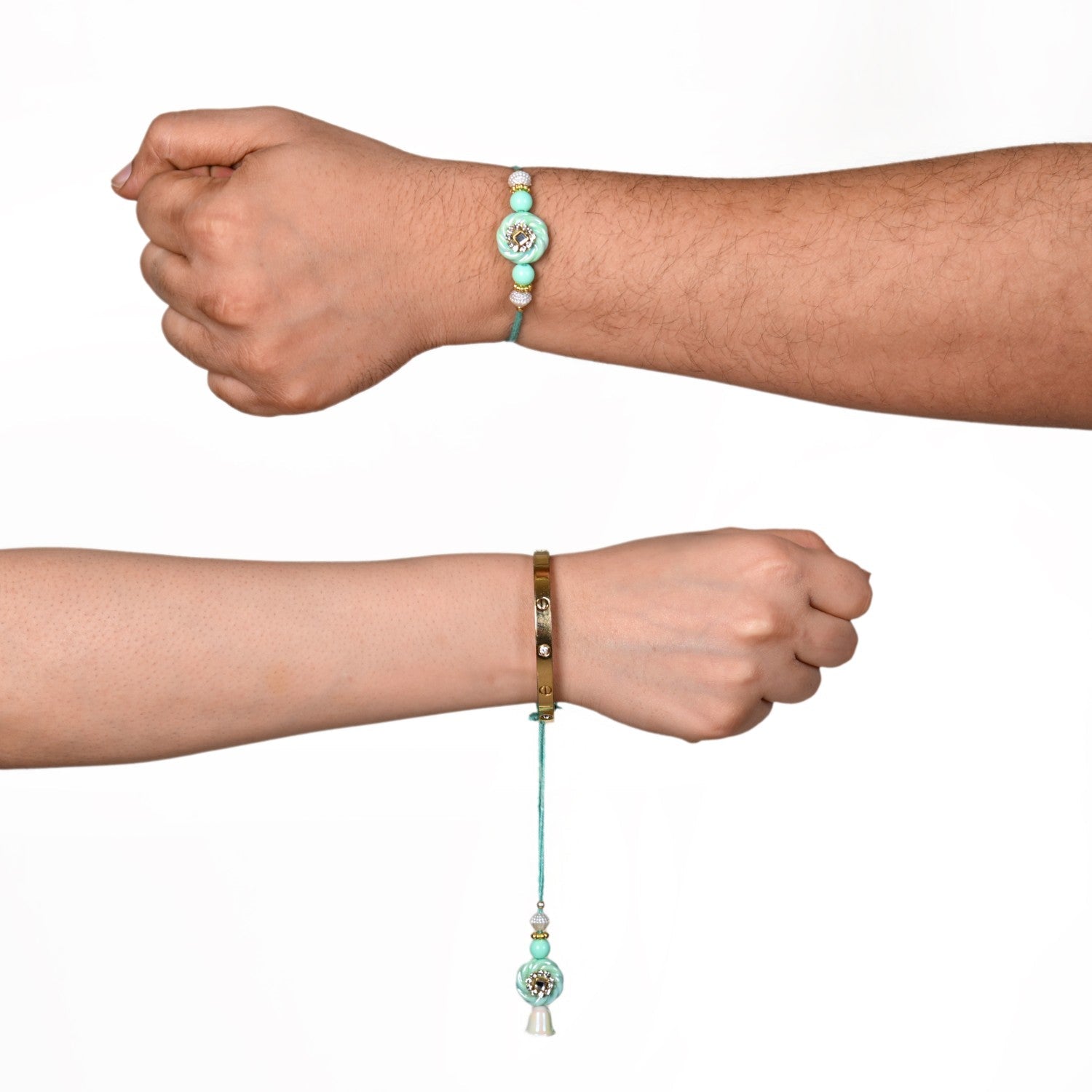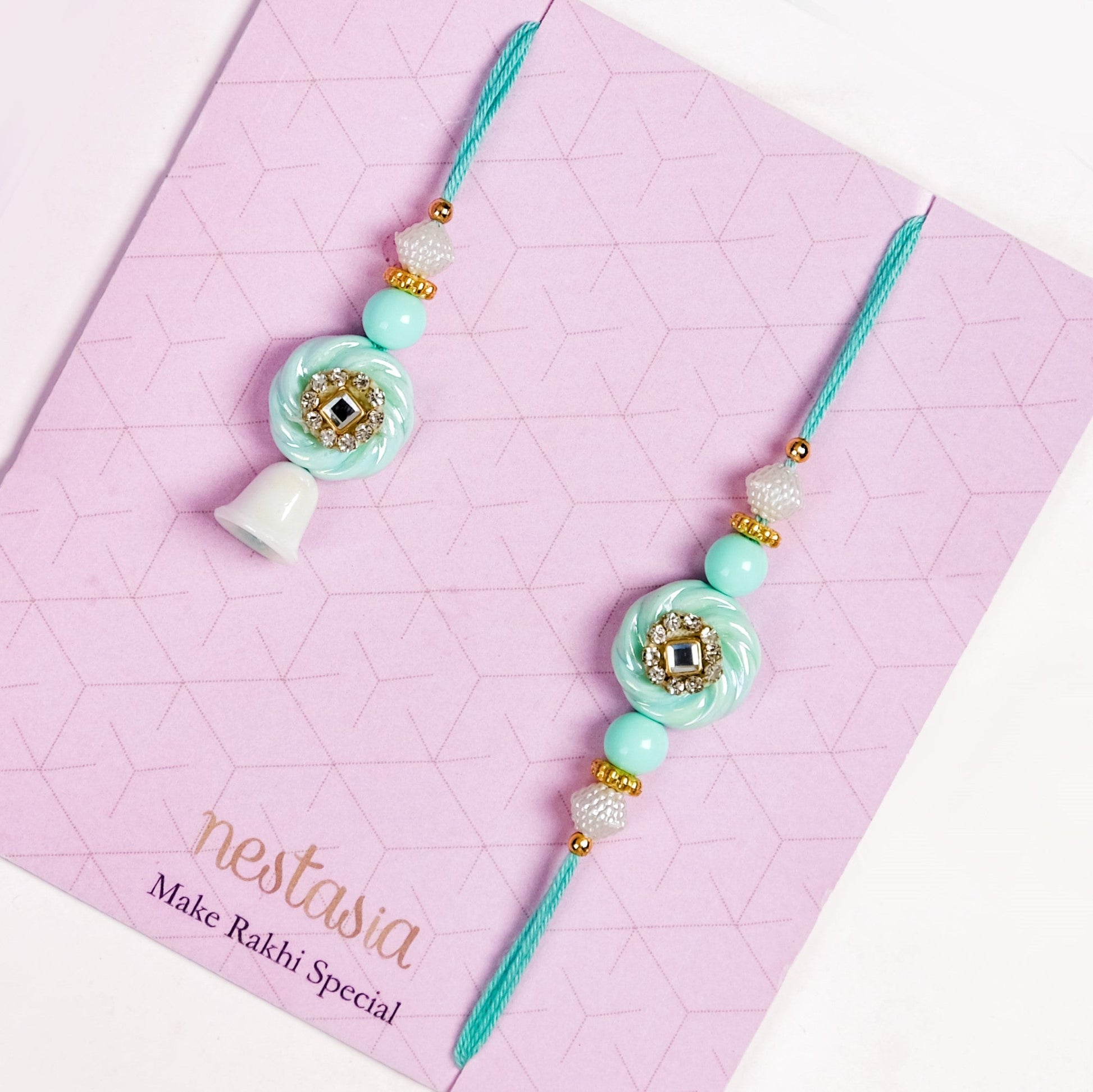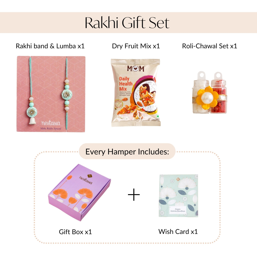 Celebrate your bond with a touch of royalty and pastel elegance with this rakhi set! The soothing mint green tones, paired with gold and white embellishments, add a regal touch. Whether your sibling prefers traditional or modern aesthetics, this rakhi strikes the perfect balance. It comes with soft braided threads for comfortable wear, and premium detailing that makes it unforgettable. Its mint green circular motif is surrounded by tiny crystals and a reflective gem, symbolising love and protection. Each set includes 1 rakhi, 1 lumba, 1 roli-chawal bottle, and 1 packet of dry fruits for the complete festive experience.