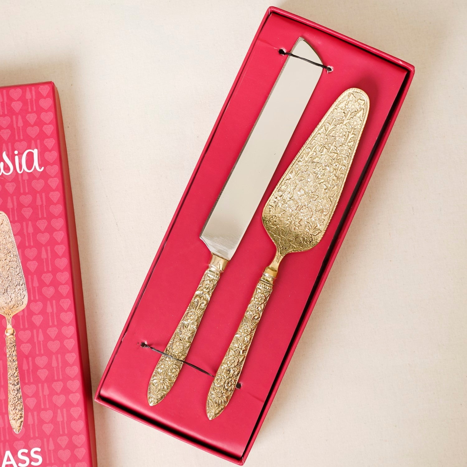 Design: Our cake knife and server set combines timeless elegance with durability, featuring a knife made with 100% pure brass and 304-grade stainless steel blade and a cake server crafted from high-quality brass. The set’s rust-resistant properties ensure that it maintains its pristine appearance over time, while the scratch and heat-resistant qualities make it ideal for frequent use and handling. Each piece is adorned with an intricately engraved floral design, adding a touch of vintage charm and sophistication. The high-sheen gloss finish enhances its luxurious appeal, making it a standout addition to any table setting. Perfect for special occasions or as a thoughtful gift, this vintage-style cake server set blends classic aesthetics with enduring functionality.