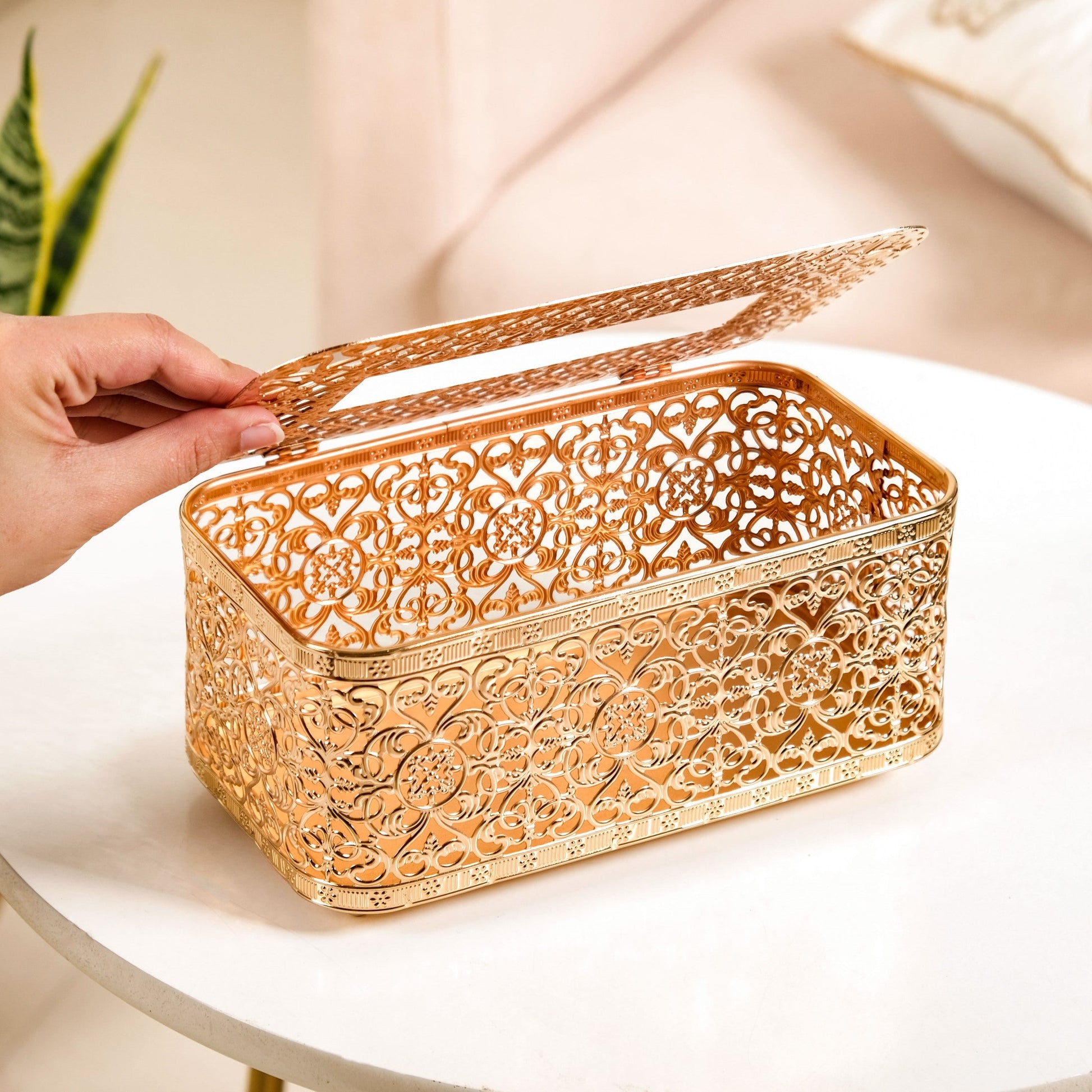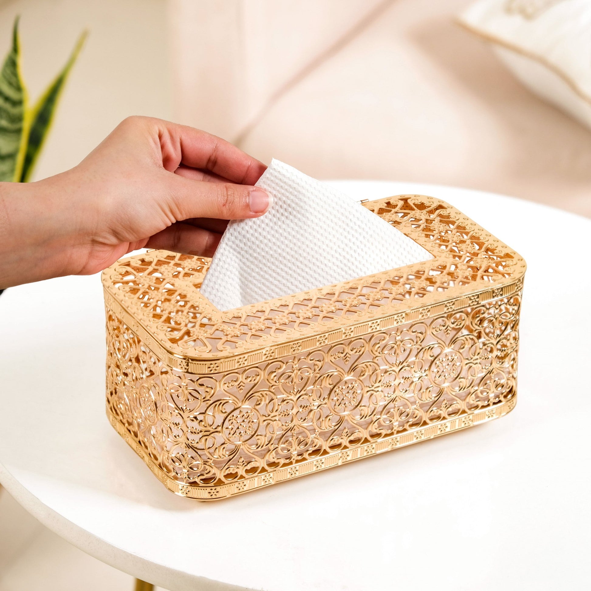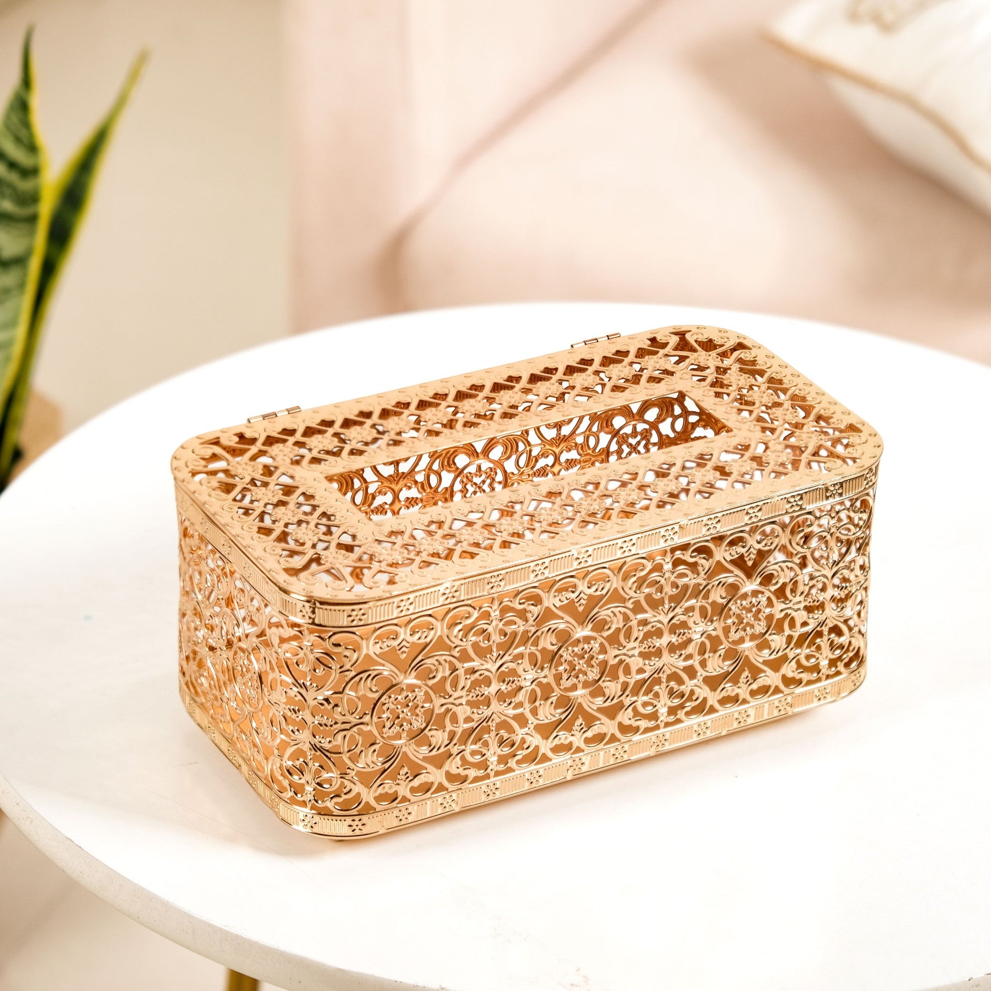 Design: The tissue paper holder is crafted from gold-toned metal with a smooth polished surface and neat finishing edges. It has a rectangular box structure enhanced with symmetrical floral motifs and detailed lattice cut-outs that create a decorative look. The hinged top opening allows effortless refilling, while the raised base support offers stability on any surface. Lightweight yet sturdy, its compact tabletop design ensures it is as functional as it is stylish.
