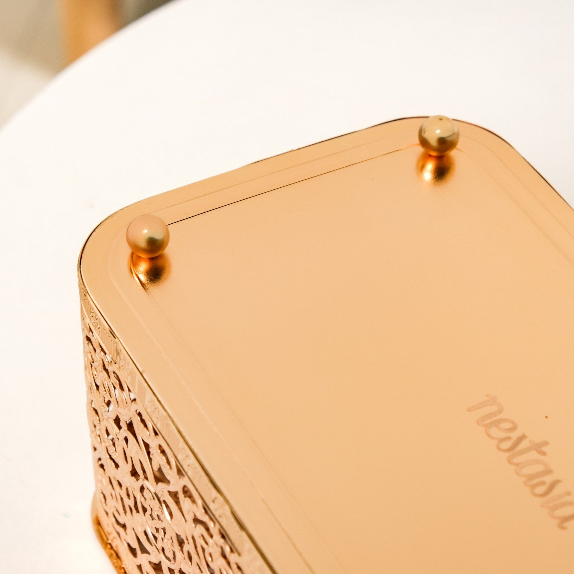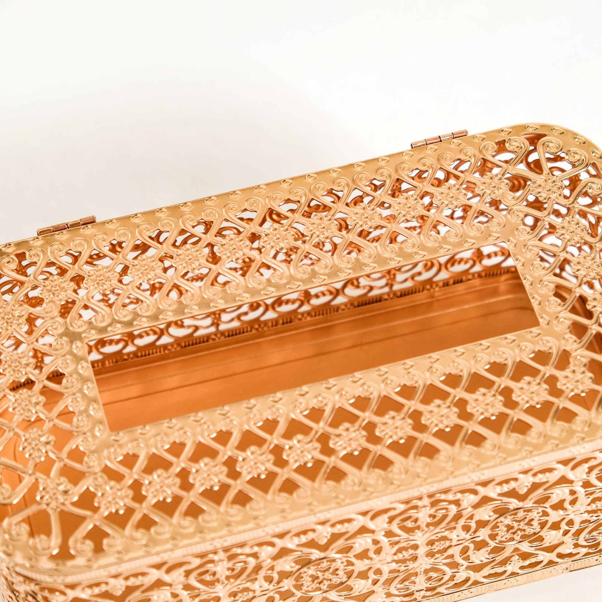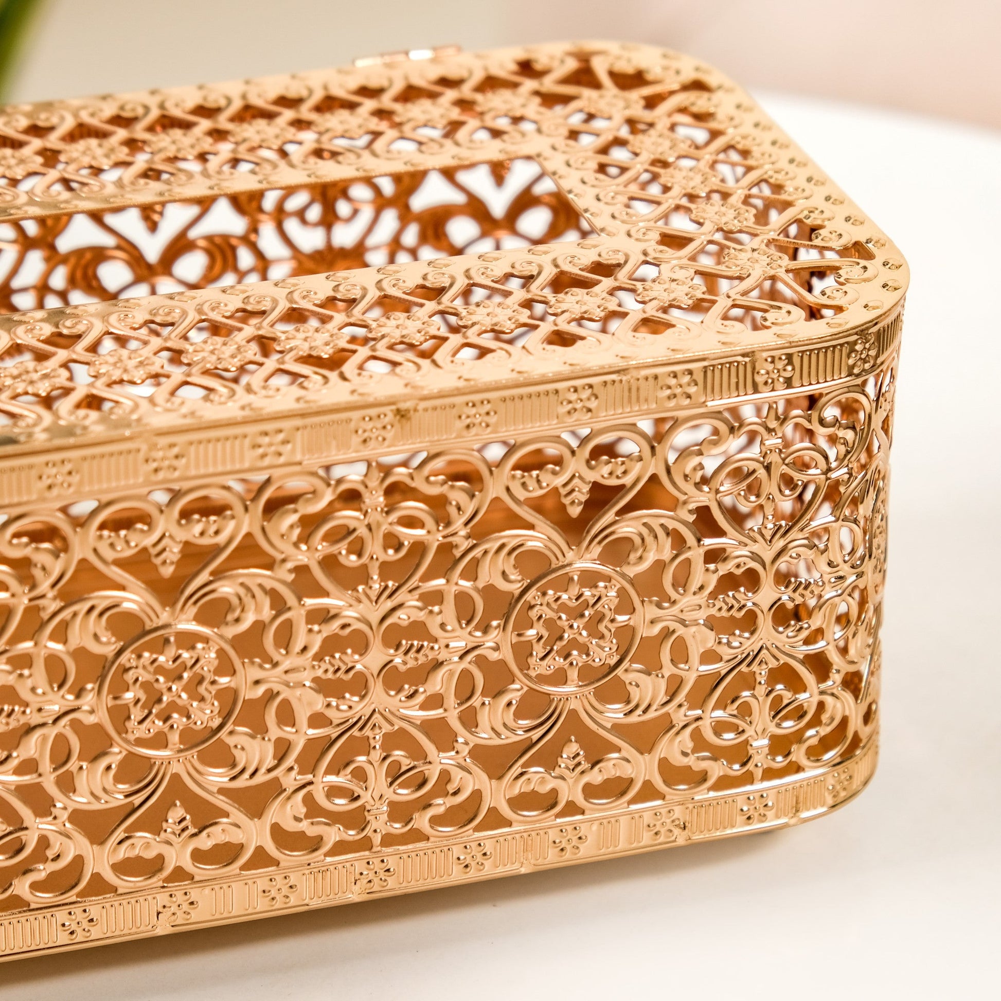 Design: The tissue paper holder is crafted from gold-toned metal with a smooth polished surface and neat finishing edges. It has a rectangular box structure enhanced with symmetrical floral motifs and detailed lattice cut-outs that create a decorative look. The hinged top opening allows effortless refilling, while the raised base support offers stability on any surface. Lightweight yet sturdy, its compact tabletop design ensures it is as functional as it is stylish.