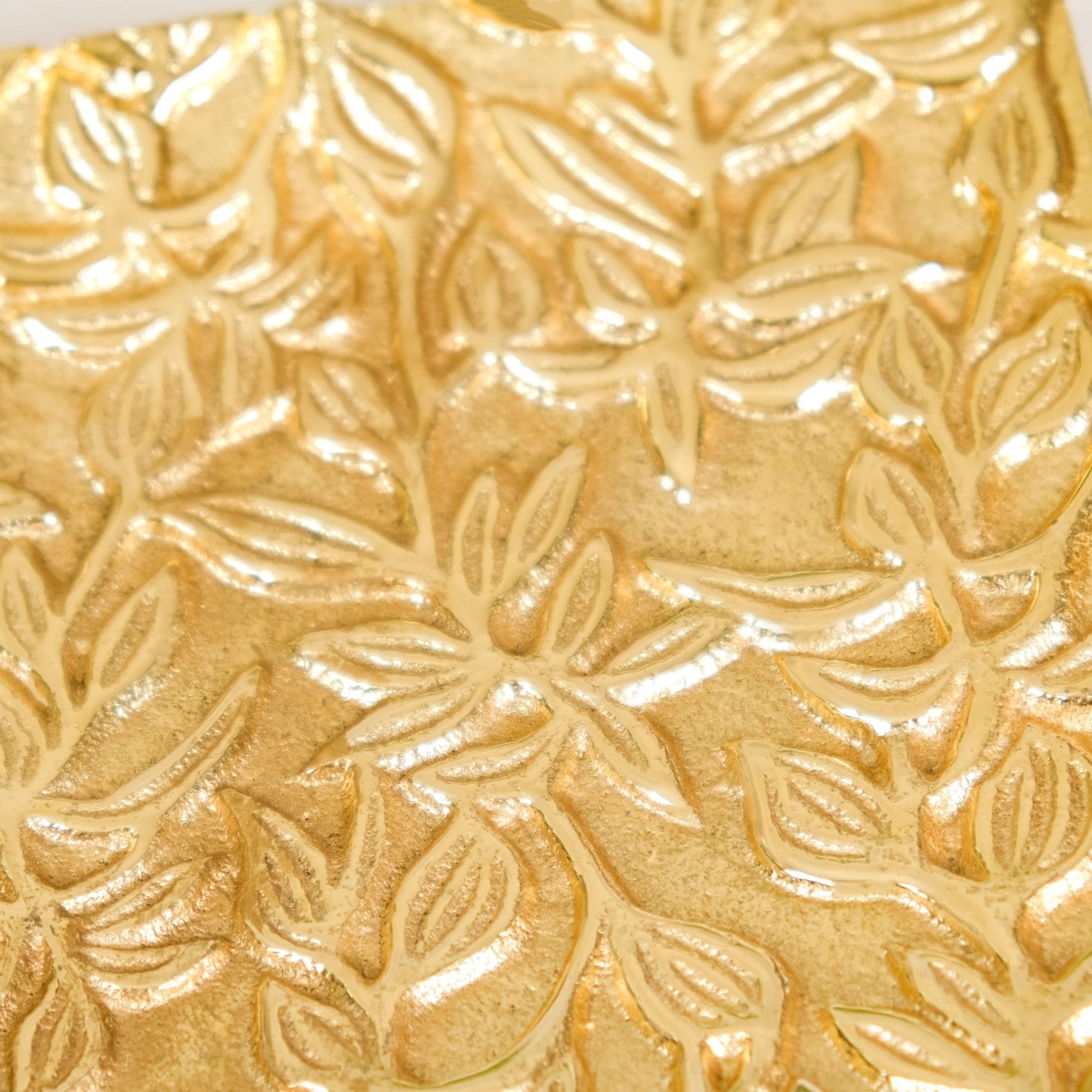 Design: This curved rectangular tray features flared sides that give it a sculpted silhouette. The surface is embossed with intricate floral detailing that adds visual depth and texture. Crafted from solid aluminium, it rests on a hollow rectangular base that gently lifts it off surfaces, creating a floating display effect. The seamless build ensures durability, while the slight curvature helps prevent items from slipping. Smooth edges make it safe to handle, and its compact size fits well on counters, consoles, or dining setups. The food-safe finish also makes it ideal for serving dry snacks or sweets.