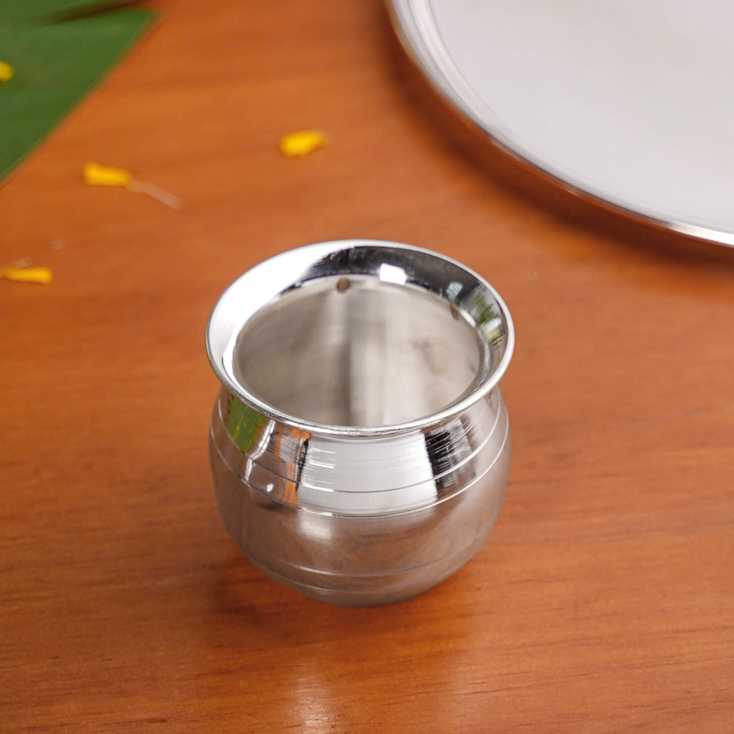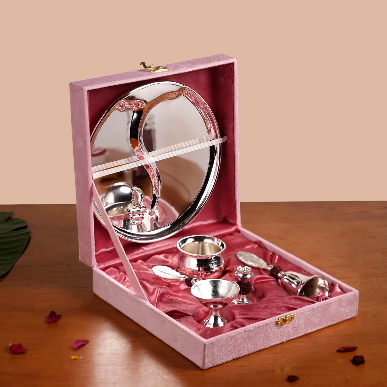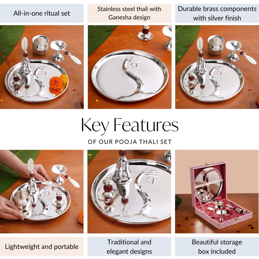 Design: The thali features an intricate depiction of Shri Ganesha, the remover of obstacles and a revered symbol of wisdom and prosperity. Accompanying this sacred centrepiece is a multi-tiered, flower-shaped agarbatti holder, crafted for fragrant offerings that elevate the spiritual ambience. The ghanti brings a clear, resonant chime to your puja, while the Kalash signifies purity and abundance. A matching diya, designed to cast a soft, devotional glow, completes the set. The ghanti, agarbatti holder, and diya are each adorned with panchmukhi rudraksha beads, enhancing their sacred significance. All components, except the stainless steel thali, are made from brass with a silver coating that evokes the sheen of chandi.